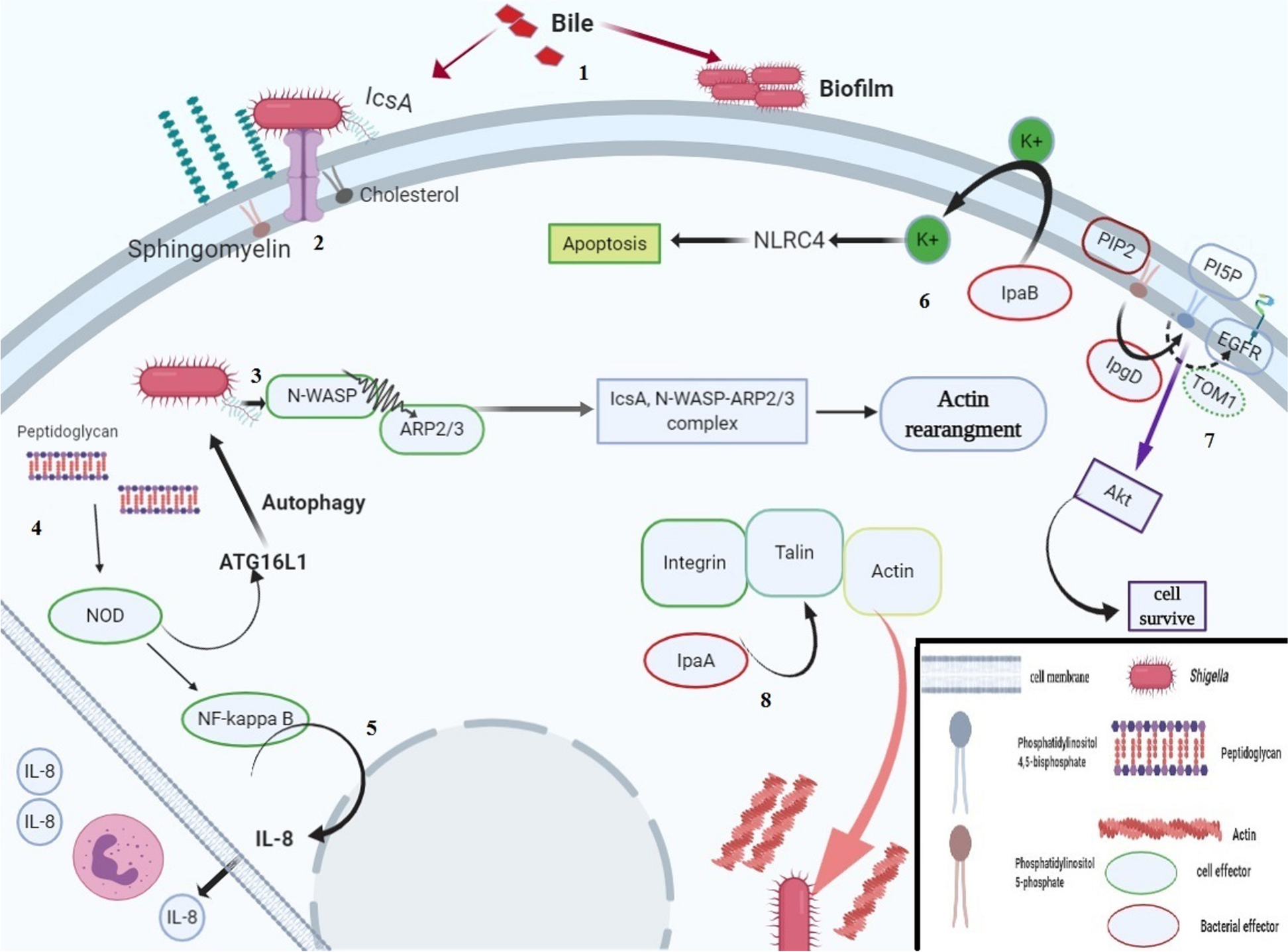 Shigella to the epithelial cell, membrane ruffle forms around the bacteria and leads to the recurrence of NOD1 and the component of NOD1 downstream signaling NF-κB essential modulator (NEMO) to the bacterial positions. Localization of NOD1 in the plasma membrane depends on F-actin [