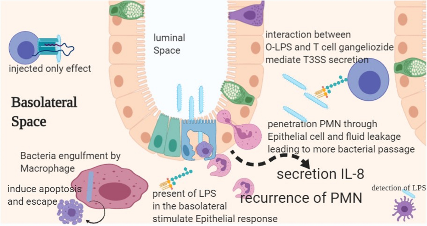 Shigella in a host cell, damage and inflammation occur. One strategy to terminate intracellular bacterial life is to program cell death. Recognition of components such as LPS and T3SS via nod-like receptor (NLR) and TLRs leads to inflammatory caspase activation [