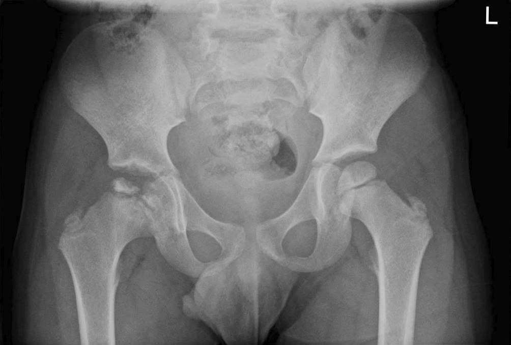 Ein fünfjähriger Junge wird in der Ambulanz der Kinderklinik vorgestellt, weil er bereits seit einigen Monaten sein rechtes Bein beim Gehen ungewöhnlich bewege. Das auffällige Gangbild sei allerdings nicht ständig zu beobachten. Eine Rötung oder Schwellung im Hüftbereich wurde bislang nicht bemerkt. Die Nachfragen zu Infektion oder Trauma werden verneint. Eine Schmerzmedikation sei zu keiner Zeit appliziert worden. Die gestern ambulant durchgeführte Sonografie des rechten Femurs habe allerdings ungewöhnliche Auffälligkeiten ergeben. Daraufhin wird umgehend ein Röntgenbild des Beckens in unserer Klinik angefertigt (Abb. 1).