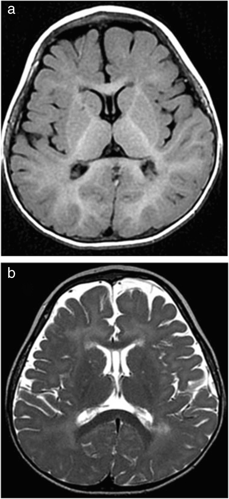 Brain magnetic resonance imaging in a 15-month-old girl with Aicardi-Goutières syndrome. a Axial T1-weighted image without contrast showing delayed myelination. b Axial T2-weighted image, at the same level, showing hypersignals in the periventricular white matter