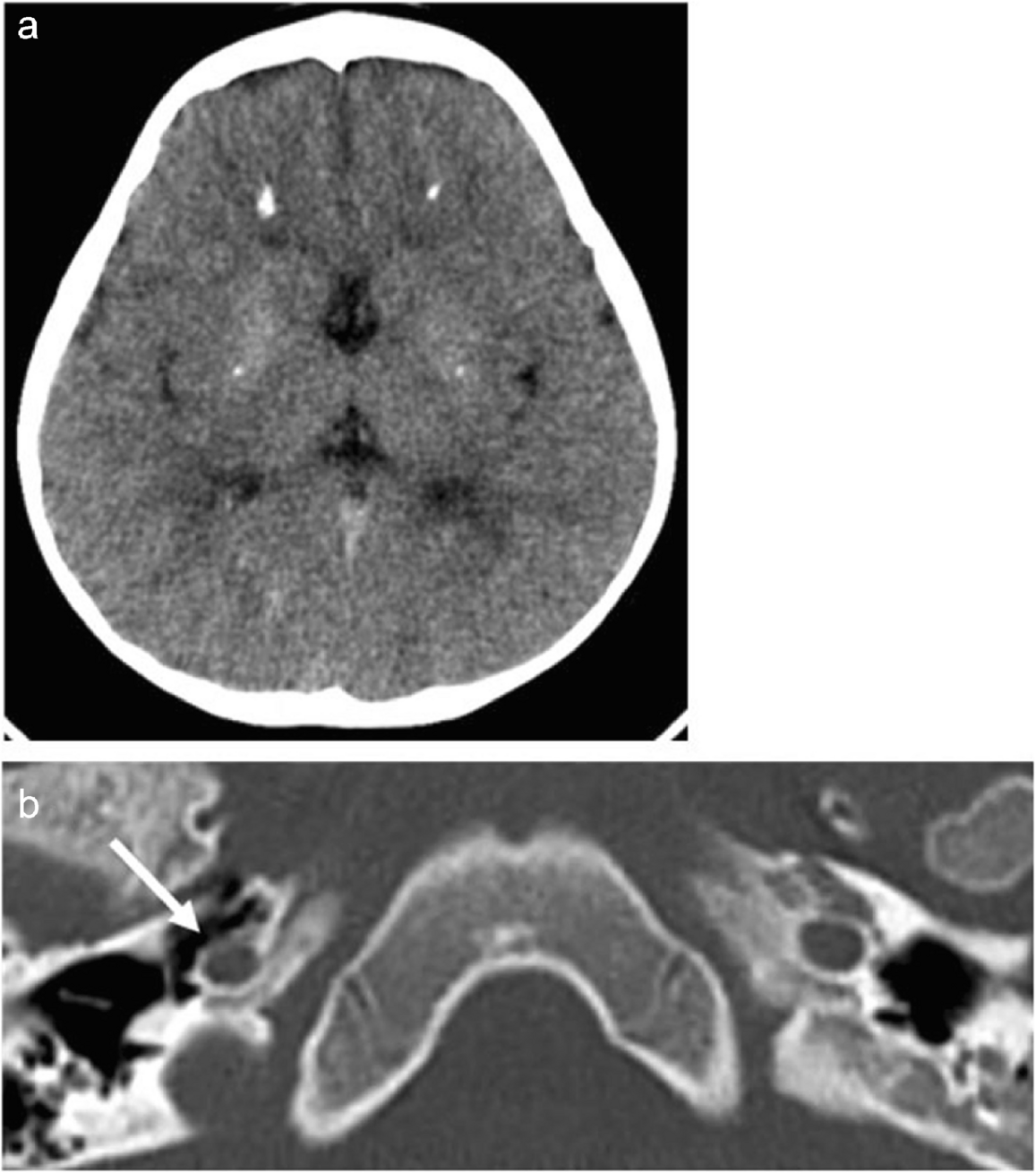 Computed tomography of the brain in a 3-year-old girl with Aicardi-Goutières syndrome. a Symmetrical calcifications in the periventricular frontal white matter and lenticulate nuclei. b Mild hypoplasia of the right carotid canal in the petrous bone (arrow)