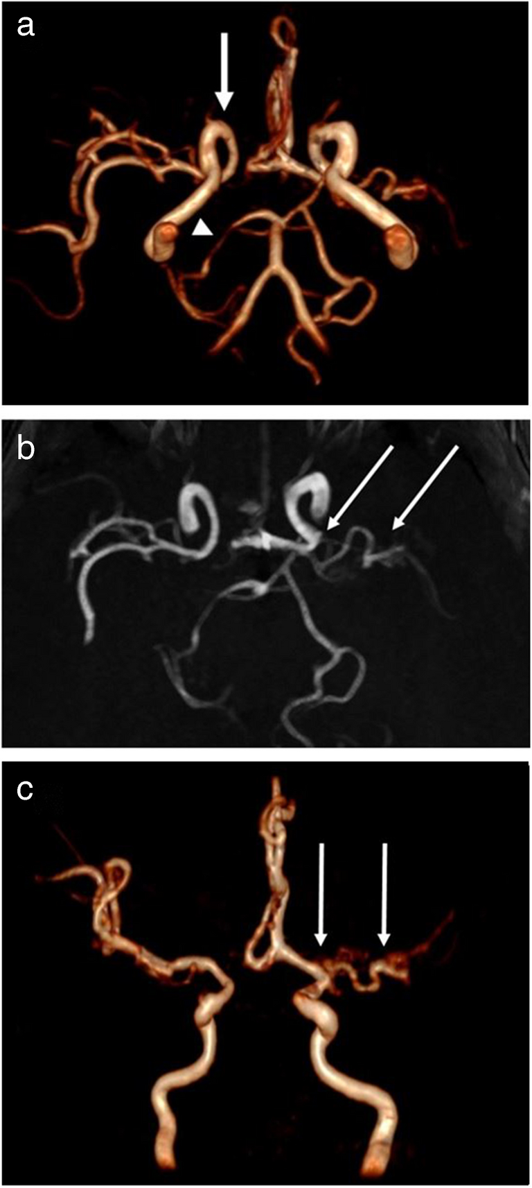 Magnetic resonance angiography (3D time-of-flight) of the brain in a 4-year-old-girl with Aicardi-Goutières syndrome. a Long stenosis of the right posterior cerebral artery (arrowhead) and mild hypoplasia of the right internal carotid artery (arrow). b, c Severe stenosis of the left middle cerebral artery origin with a dilated collateral arterial network (long arrows)
