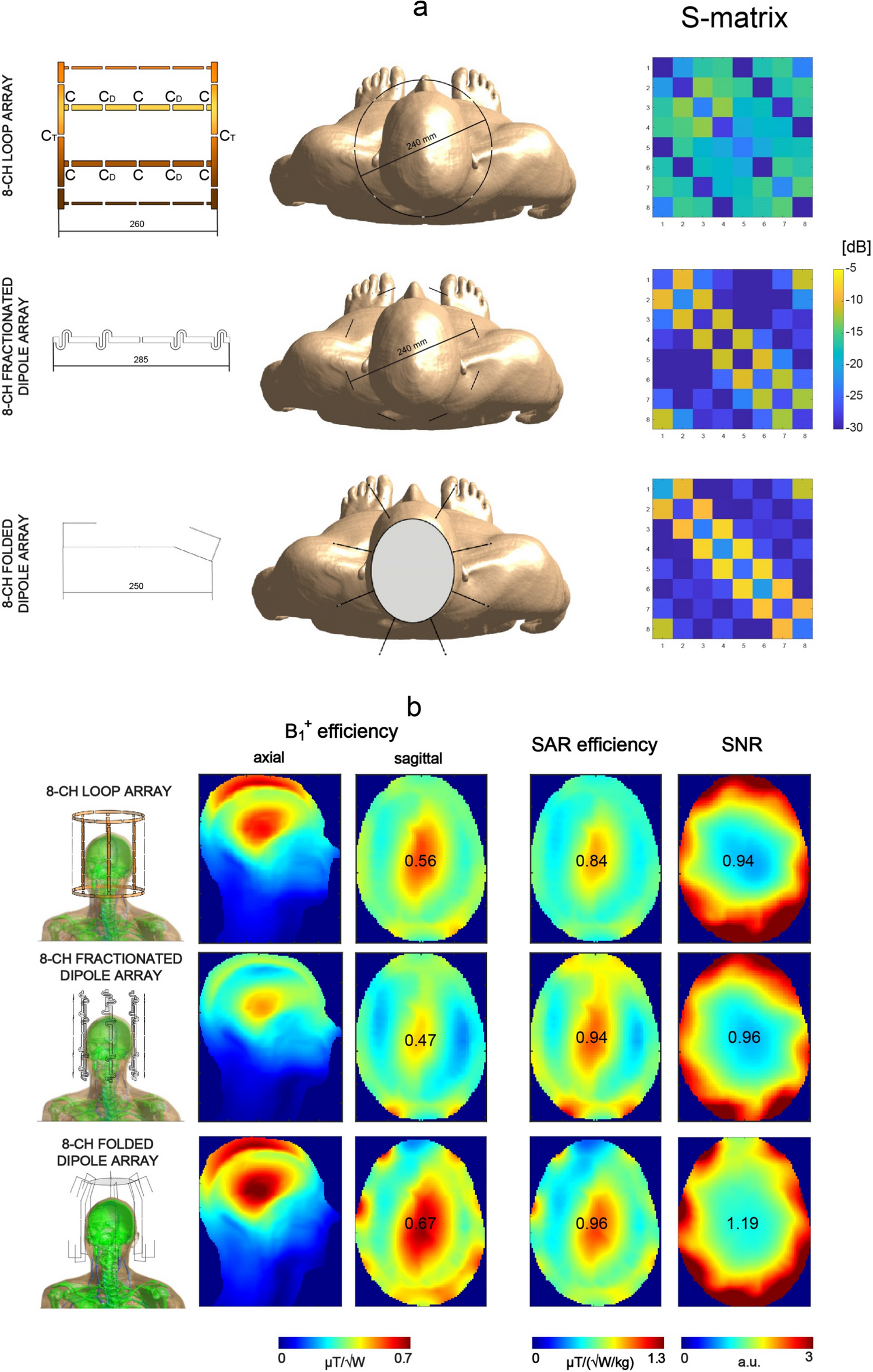 B1+ efficiency, SAR efficiency and SNR in the human voxel model Duke (central XY plane) for three reference array designs (see Methods). The highest transmit performance along with the highest central SNR was found for the close-fitting 8-channel folded dipole antenna array. Despite higher peak B1+ in the center of Duke’s head for the folded dipole array, an average B1+ (and B1+ homogeneity) across the whole axial slice was higher for the loop-coupled DRA arrays from Fig. 8 (see “Discussion”)