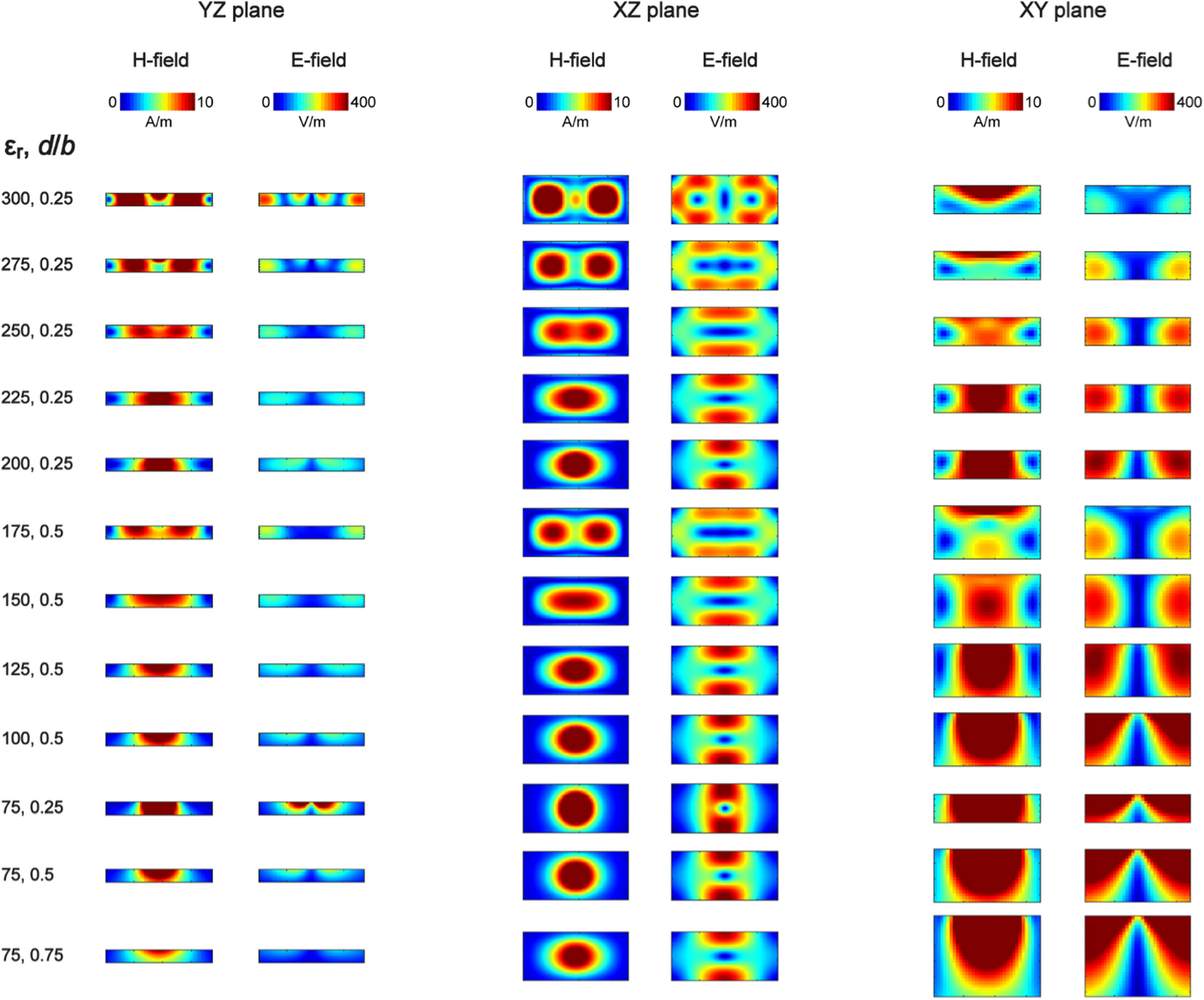 Magnetic \(\overrightarrow{H}\) and electric \(\overrightarrow{E}\) field distribution inside each one of the selected loop-coupled dielectric resonator antennas. Absolute \(\overrightarrow{H}\) and electric \(\overrightarrow{E}\) fields are shown in three planes through the central point of each dielectric block. The most apparent difference can be observed in XZ plane with two electromagnetic field maxima for εr = 175, εr = 275 and εr = 300, instead of one as for the other rectangular blocks