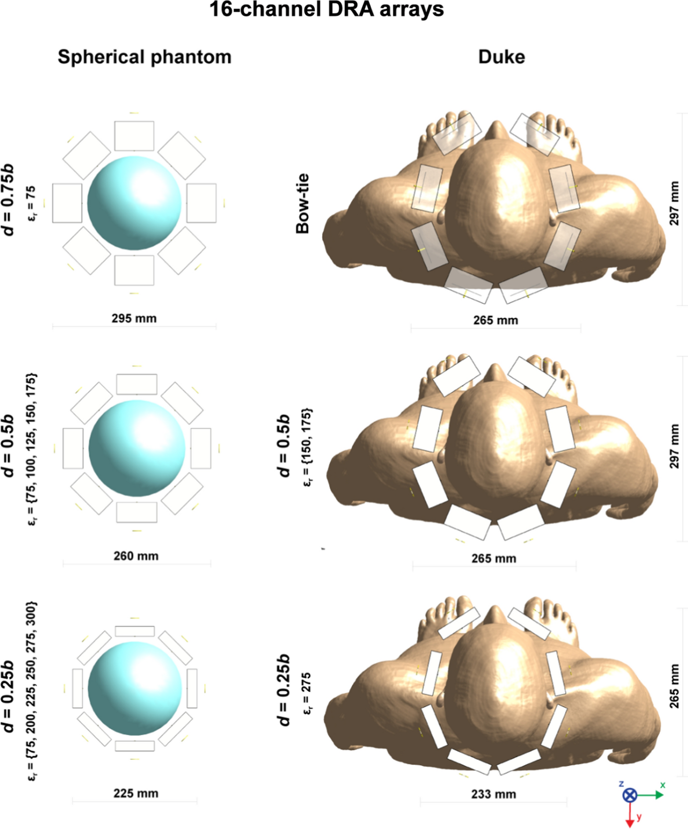 Schematic representations of 16-channel (only bow-tie is an 8-channel array), loop-dipole combined, rectangular dielectric resonator antenna arrays investigated in this study, loaded with a spherical phantom (on the left) and with human voxel model Duke (on the right)