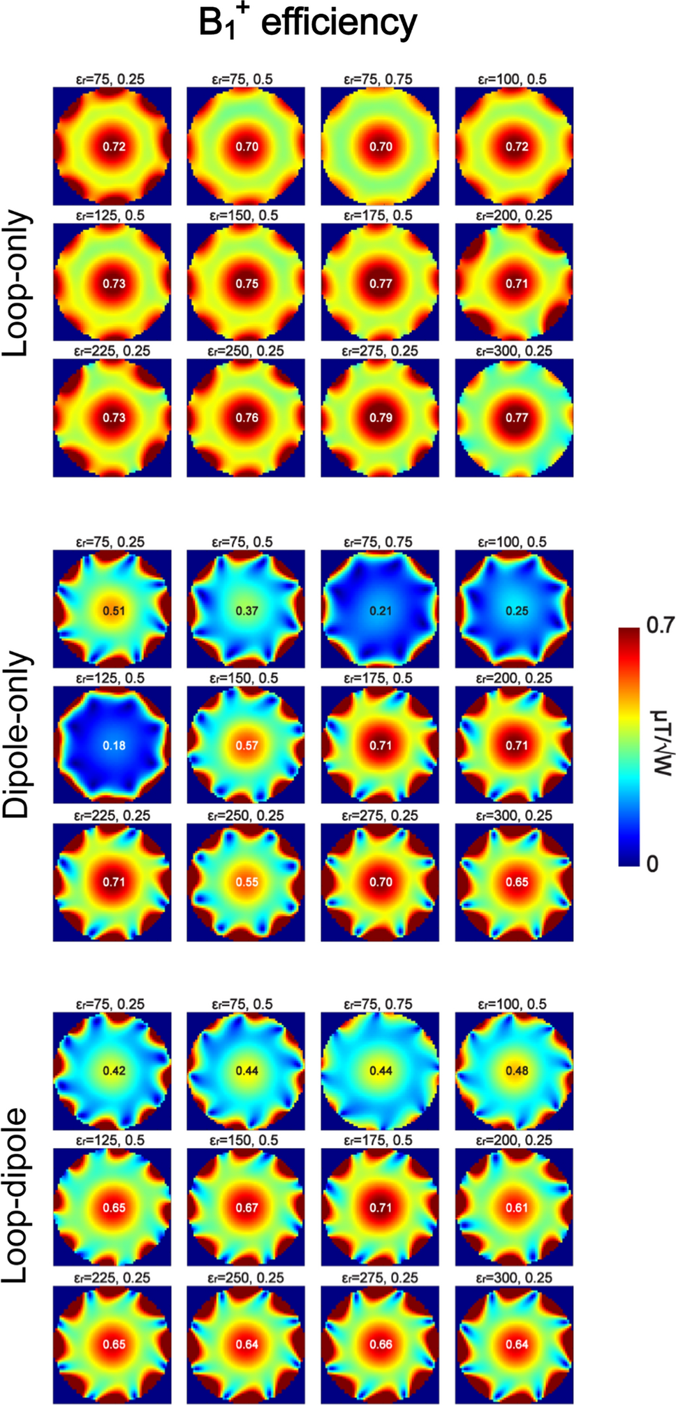 B1+ distribution in the spherical phantom (central XY plane) for all 12 of the 16-channel, loop-dipole (dipole bottom) coupled dielectric resonator antenna arrays. The data showed that loop-only coupling scheme provided the highest B1+ efficiency in the center of the phantom for all of the arrays. The highest B1+ efficiency was observed for the blocks in which a higher-order TE mode was excited: εr = 275 (0.79 μT/√W), εr = 175 (0.77 μT/√W) and εr = 300 (0.77 μT/√W)