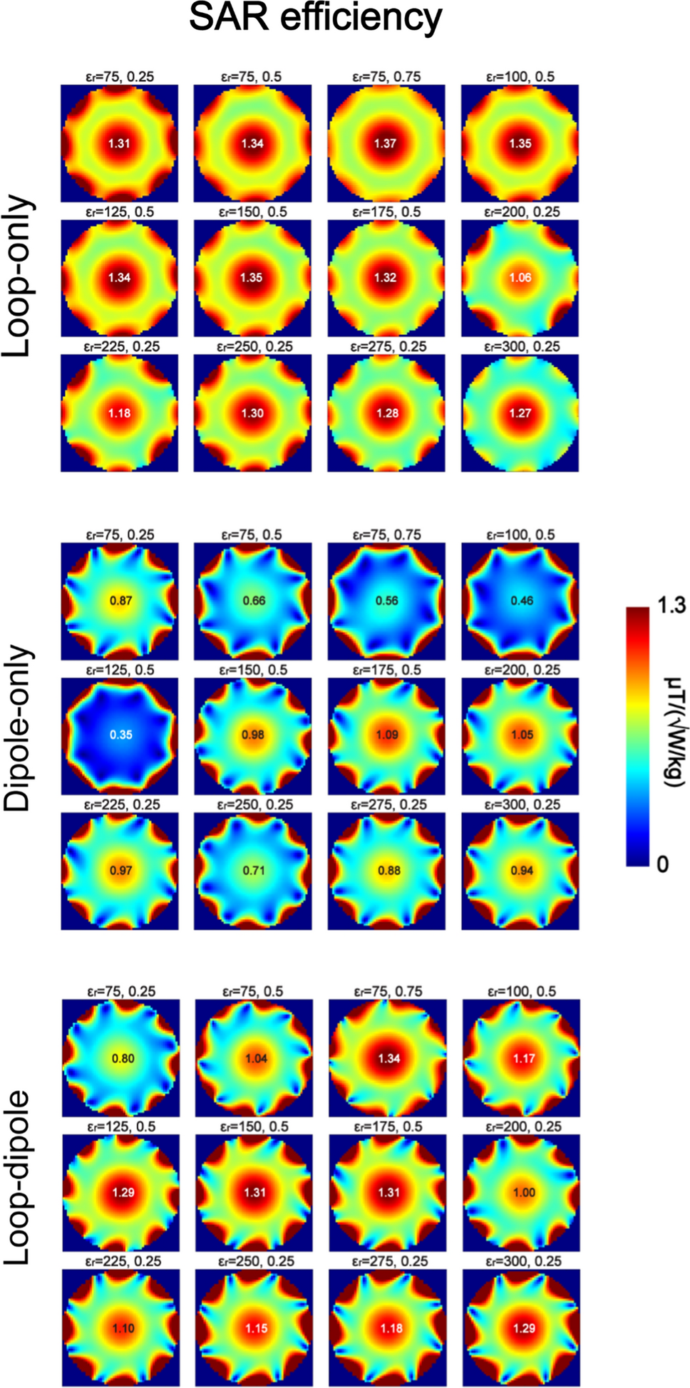 SAR efficiency in the spherical phantom (central XY plane) for all 12 of the 16-channel, loop-dipole (dipole bottom) coupled dielectric resonator antenna arrays. The data showed that loop-only coupling scheme provided the highest SAR efficiency in the center of the phantom for all of the arrays. The highest SAR efficiency was observed for thicker blocks with lower εr than the ones in Fig. 1: εr = 75, d/b = 0.75 (1.37 μT/√(W/kg)); εr = 100, d/b = 0.5 (1.35 μT/√(W/kg)) and εr = 150, d/b = 0.5 (1.35 μT/√(W/kg))