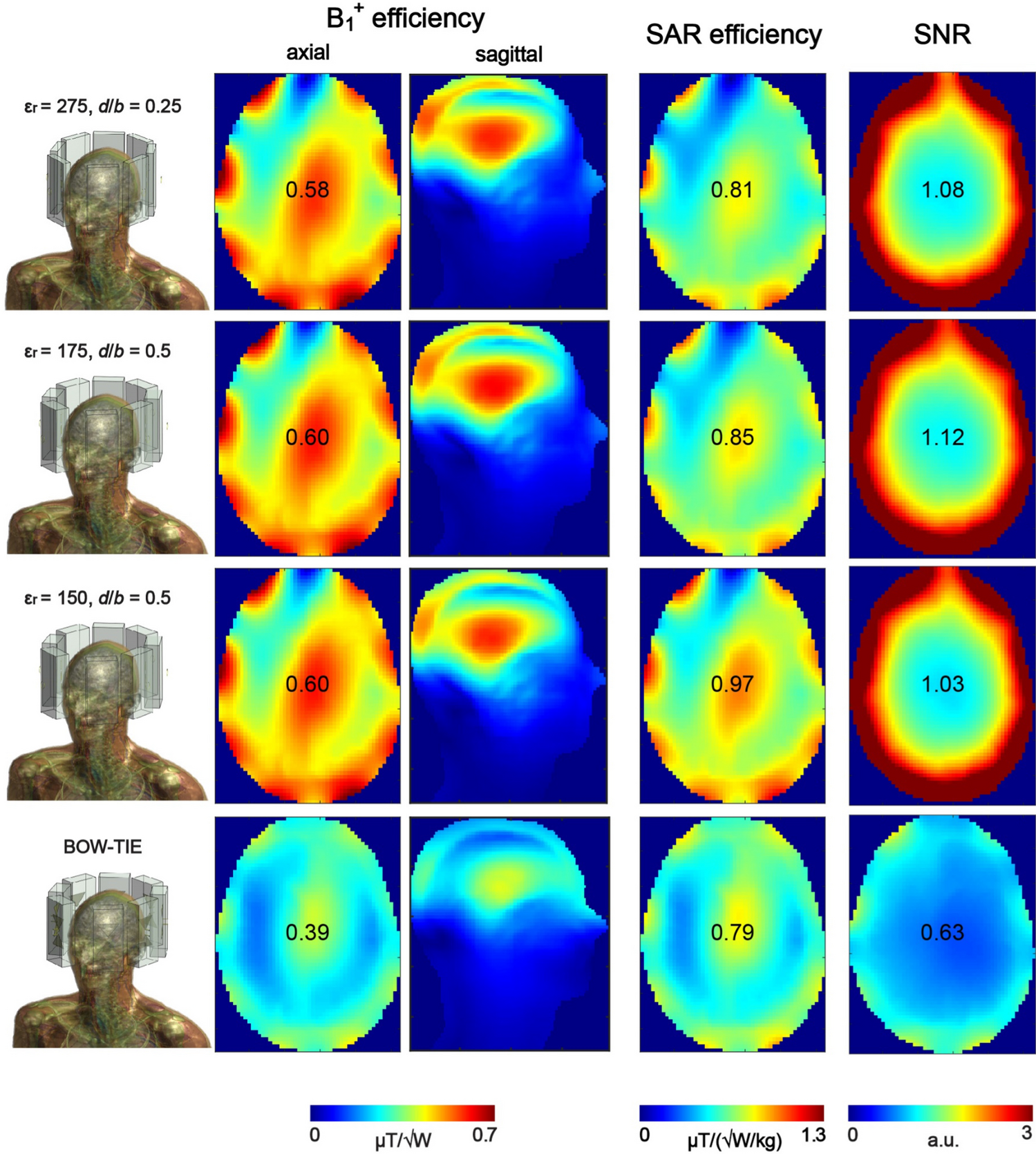 B1+ efficiency, SAR efficiency and SNR in the human voxel model Duke (central XY plane). Three different loop-dipole coupled rectangular dielectric resonator arrays were chosen and benchmarked against an 8-channel bow-tie antenna array. Each one of the loop-dipole coupled arrays (loop-only for transmission, and loop-dipole for reception) provided substantial B1+ efficiency (1.54-fold for εr = 175) and SNR (1.77-fold for εr = 175) gain in the center. SAR efficiency was also higher especially for εr = 150 (1.23-fold)
