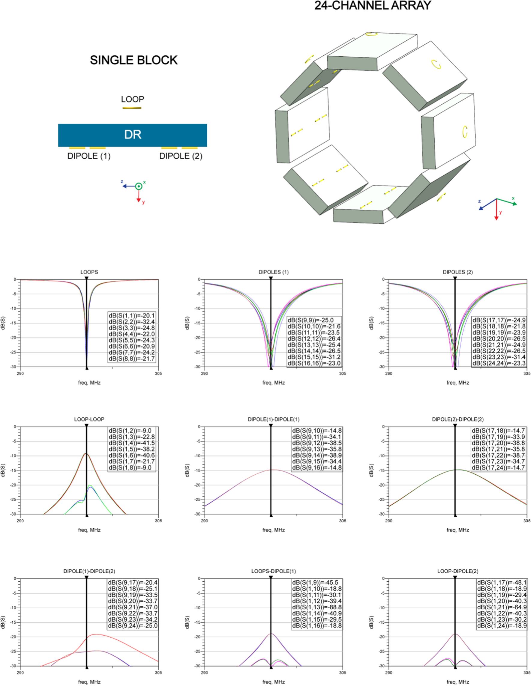 Multi-feed, loop-dipole combined, 24-channel rectangular dielectric resonator antenna array (εr = 275, d/b = 0.25). The scattering parameter matrix was evaluated. For the adjacent elements, loop-loop coupling was − 9.0 dB. Dipole–dipole (row 1) coupling was − 14.8 dB and − 14.7 dB (row 2). Dipole–dipole coupling between adjacent rows (1 and 2) was below − 20 dB. Loop-dipole coupling was − 18.8 (row 1) and − 18.9 (row 2)