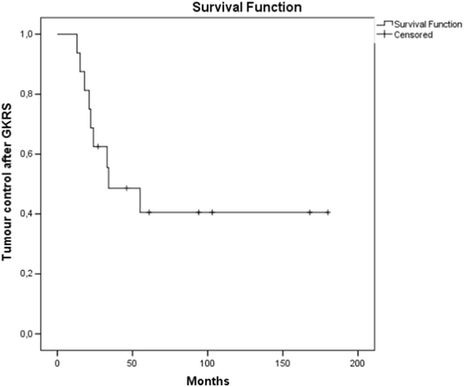 GKRS was performed in 16 out of 22 patients at a median time of 22 (range, 7–116) months after the first microsurgical treatment. No patients received GKRS prior to microsurgery. Since none of the microsurgery was considered radical, the indication for GKRS was tumour recurrence/progression after watchful waiting with serial imaging (