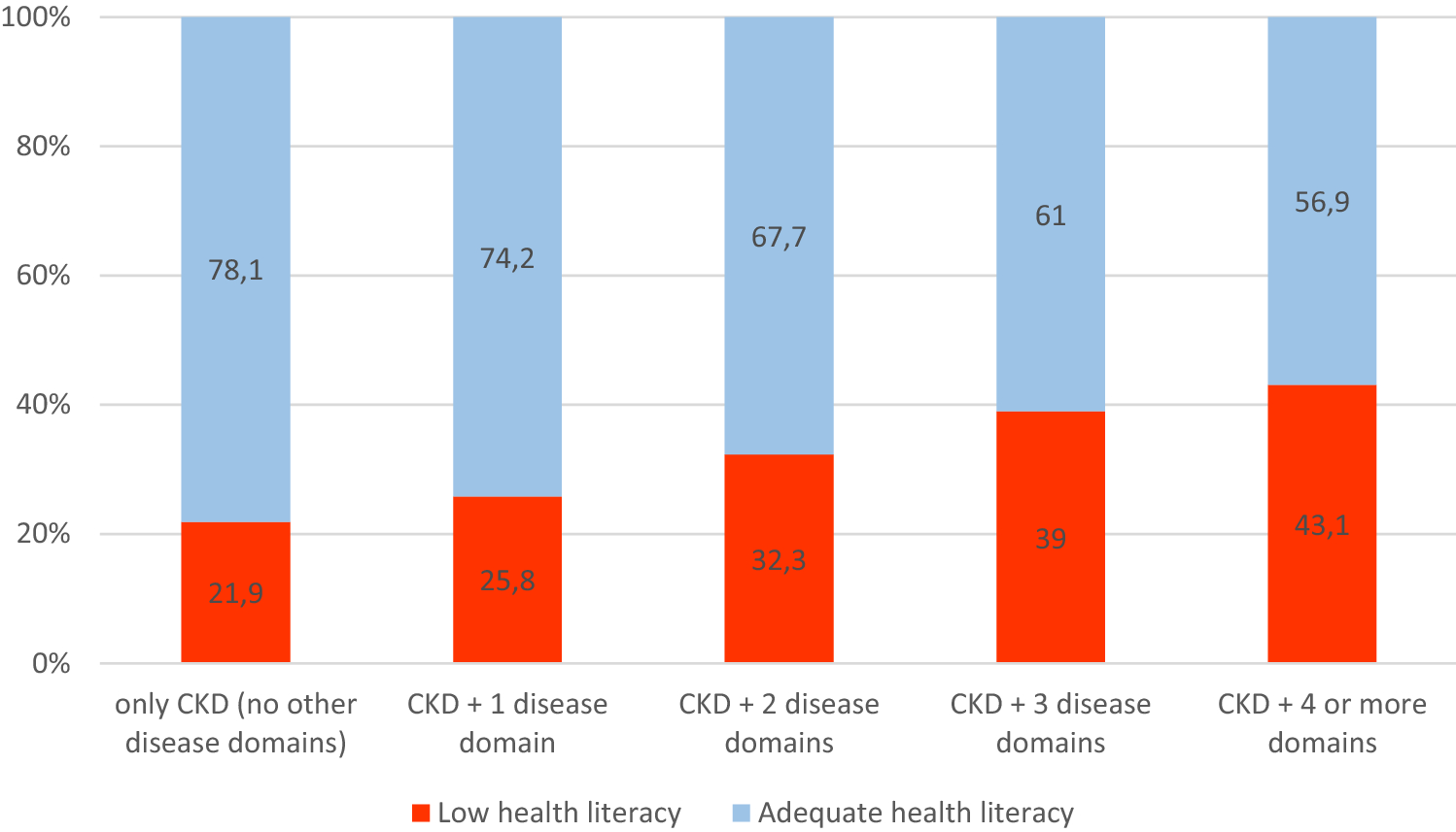 2]. These patients, thus, develop more comorbidities, which may negatively impact the prognosis of CKD. Our results contribute to the body of literature on the association between low health literacy and multimorbidity, which has until now shown mixed results [