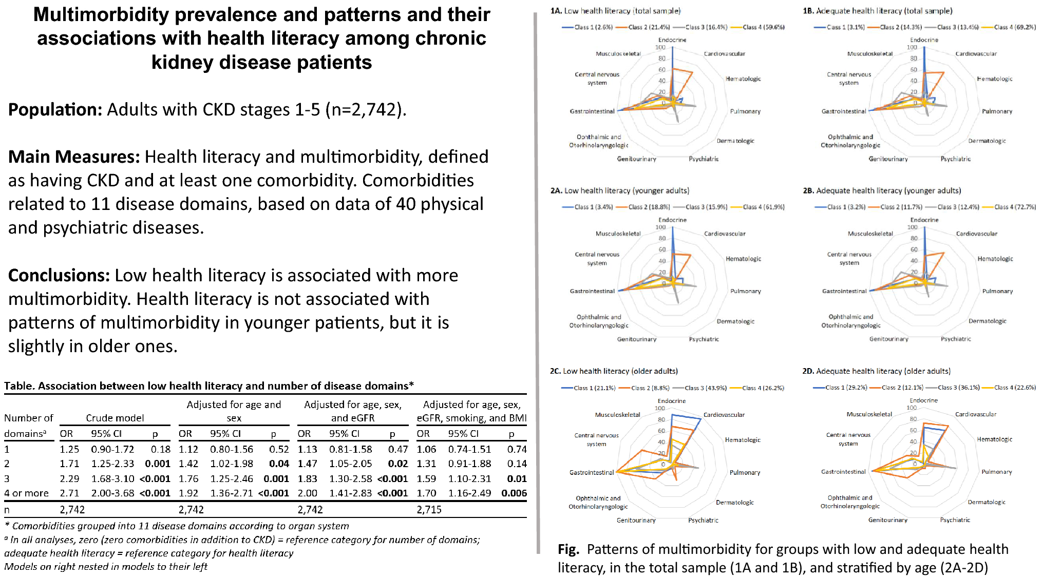 Future research should study the factors that mediate the association between low health literacy and multimorbidity to support the development of interventions to assist CKD patients. Ideally, research should be performed longitudinally, noting the trajectory and evolution of comorbidities, as well as health literacy, along the life course.