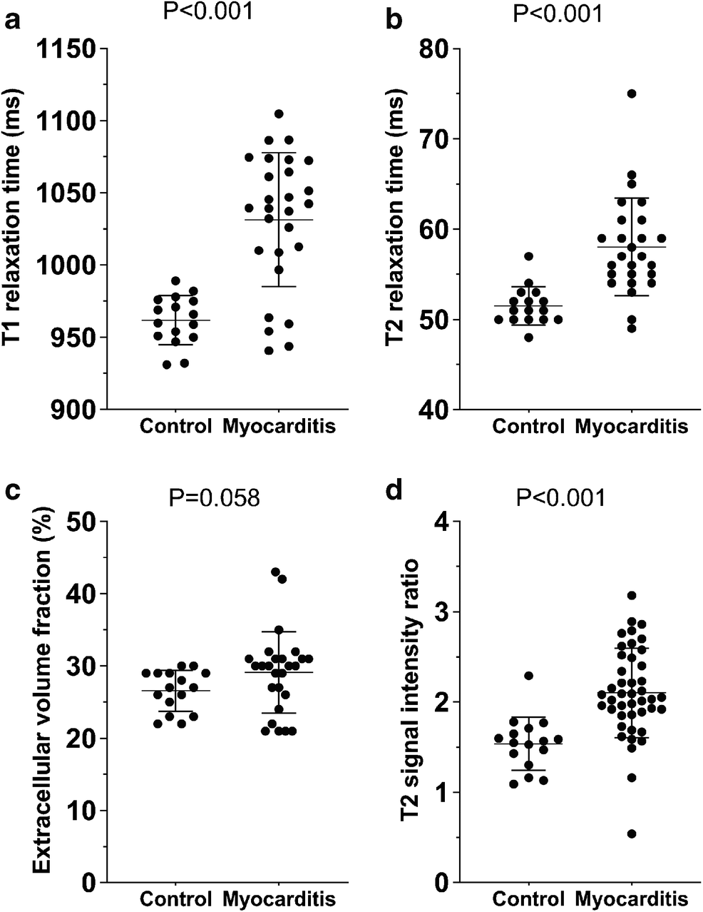 T1 relaxation time, native (ms) | 1,031±46 | 962±17 | <0.001 |