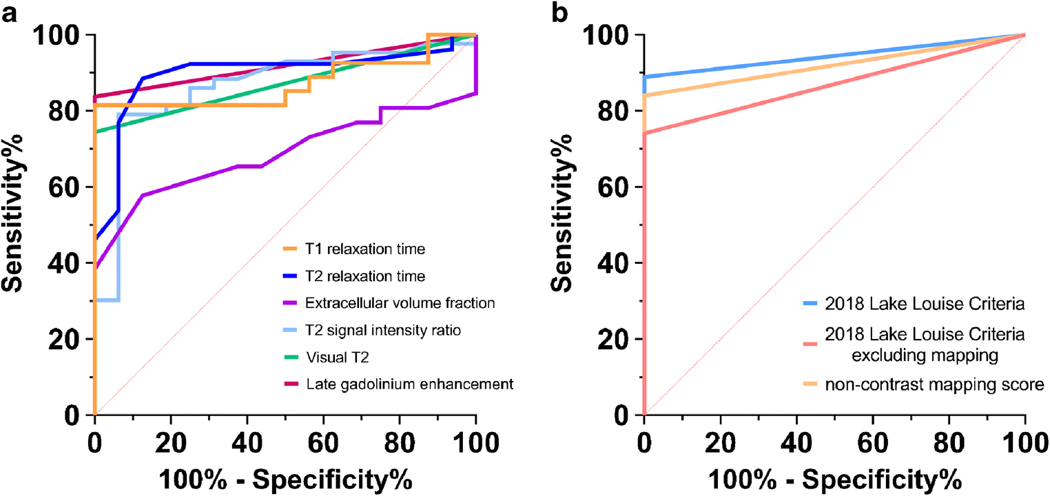 Non-contrast score (native T1 + T2 mapping) | 0.920 (0.792–0.982) | 85 (64–96) | 100 (79–100) | |