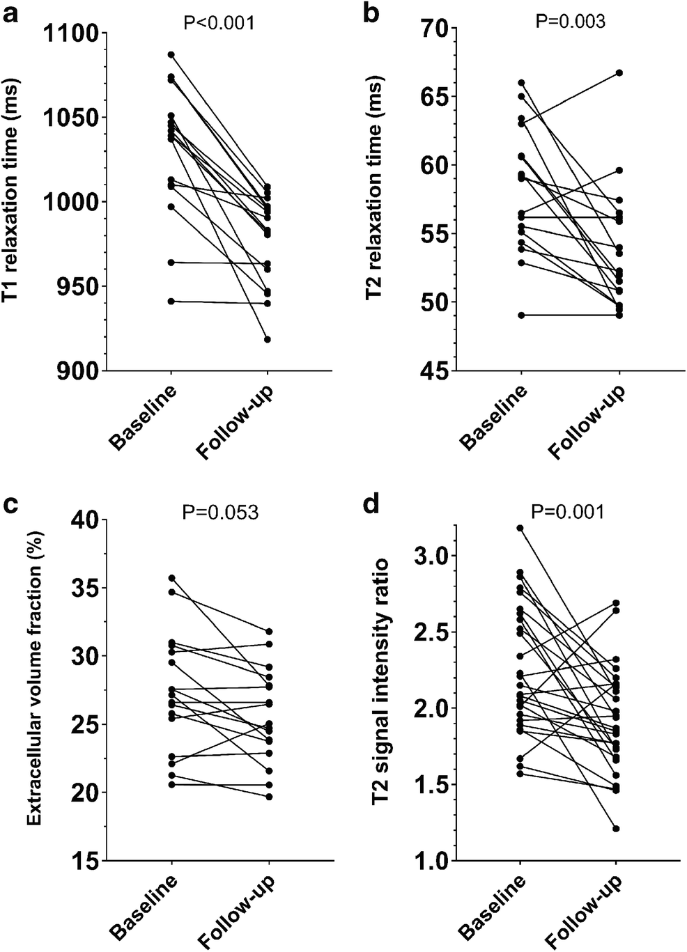 T1 relaxation time, native (ms) | 1,032±39 | 975±33 | <0.001 |