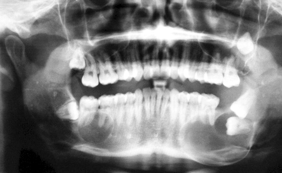 A 23-year-old male presented with three lesions, two in the mandible and one in the maxilla. An orthopantomogram (OPT) radiograph revealed three cystic lesions, the mandibular lesions were both well-defined and corticated (Fig. 1). In the right body of the mandible, a spherical radiolucency was noted overlying the roots of the lower right first and second molars. In the left body of the mandible, there was a larger radiolucent lesion with evidence of cortical expansion and displacement of the lower left second and third molars. A less well-defined radiolucency was seen in the left posterior maxilla. This lesion appeared to be multilocular and had inverted the third molar tooth and displaced it upwards into the posterior wall of the antrum.