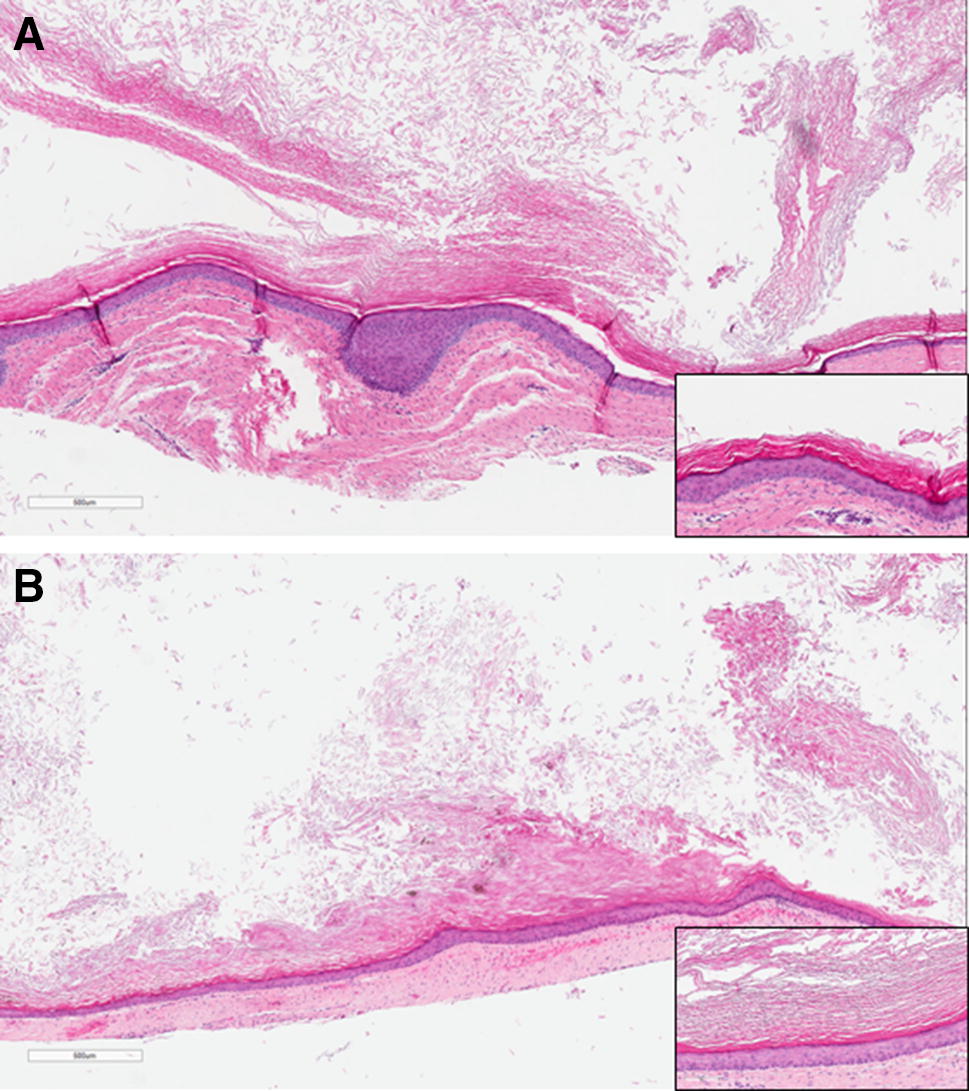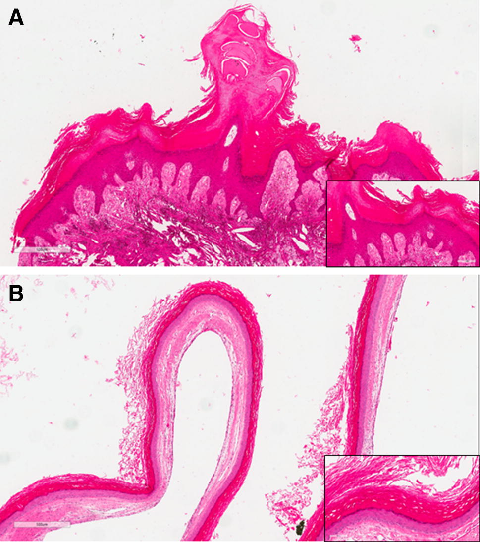 Histological appearance of the cysts in case 1. a Cyst from the left angle of mandible showing prominent orthokeratosis and a mild verrucous appearance, H&E stain, original magnification × 4. Insert bottom right, H&E stain, original magnification × 10. b Cyst from the right mandible showing prominent orthokeratosis, H&E stain, original magnification × 4. Insert bottom right, H&E stain, original magnification × 20