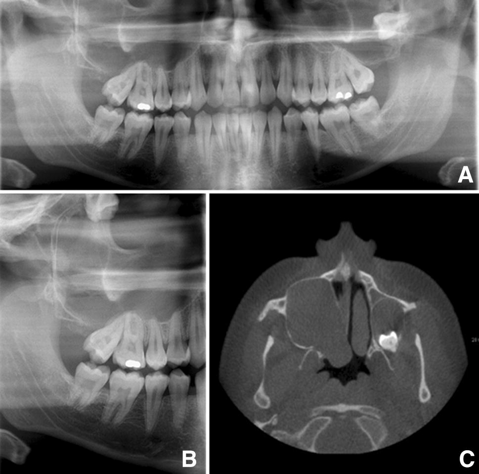 A 20-year male presented for extraction of a partially erupted and disto-angular positioned upper right second molar. On routine pre-operative radiographs, it was noted that both the left and right upper third molar teeth were impacted, displaced and associated with large, expansile radiolucencies (Fig. 3a, b). A Cone Beam CT (CBCT) revealed extensive expansion of both the right and left maxillary sinus by a soft tissue lesion (Fig. 3c), with the right lesion showing soft tissue extending up to the orbital floor. Both third molars had been displaced superiorly. The axial view (Fig. 3c) clearly shows the extensive medial and posterior expansion of the right maxillary sinus. The clinical differential diagnosis included OKC and dentigerous cyst.