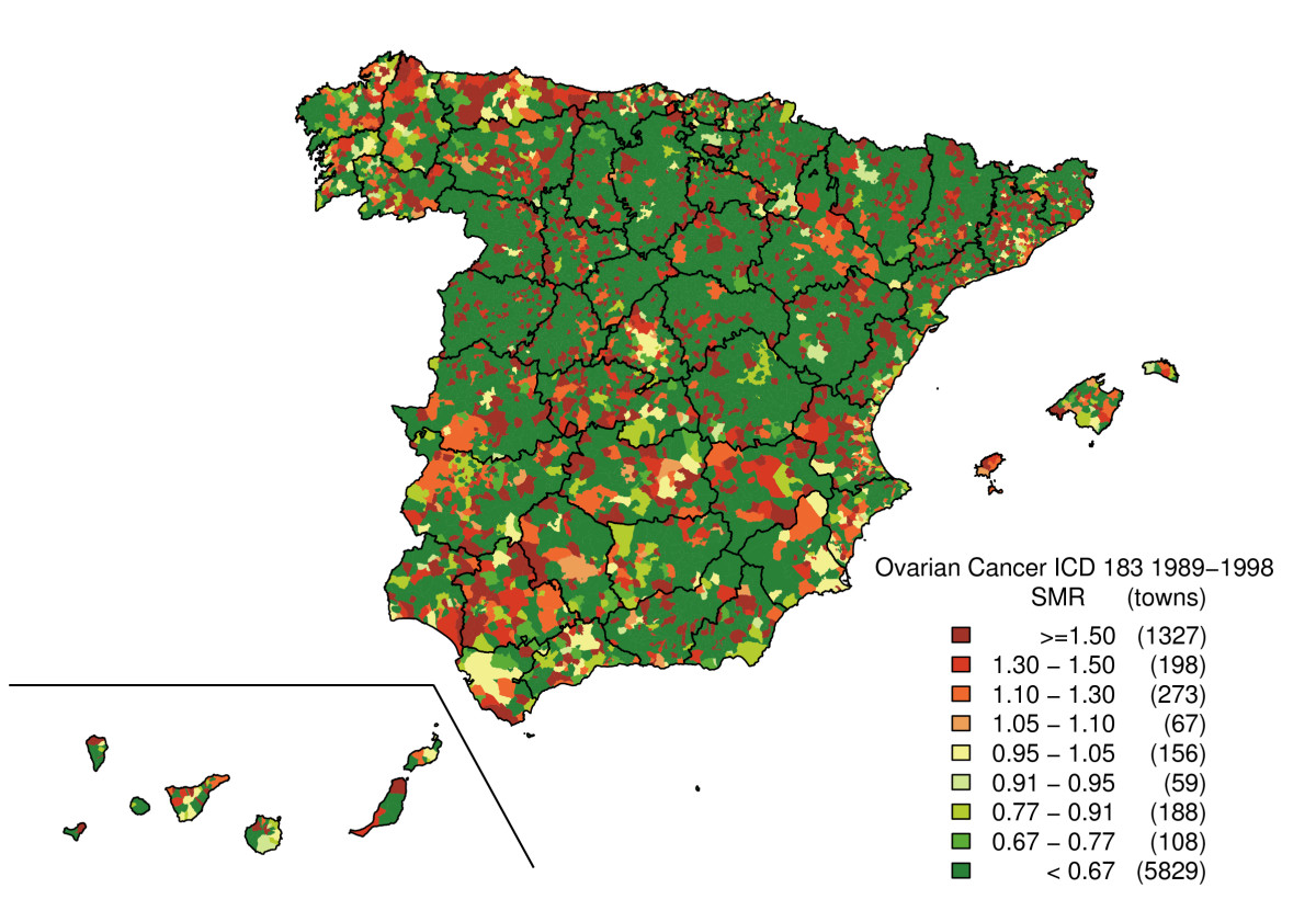 Municipal distribution of ovarian cancer mortality in Spain