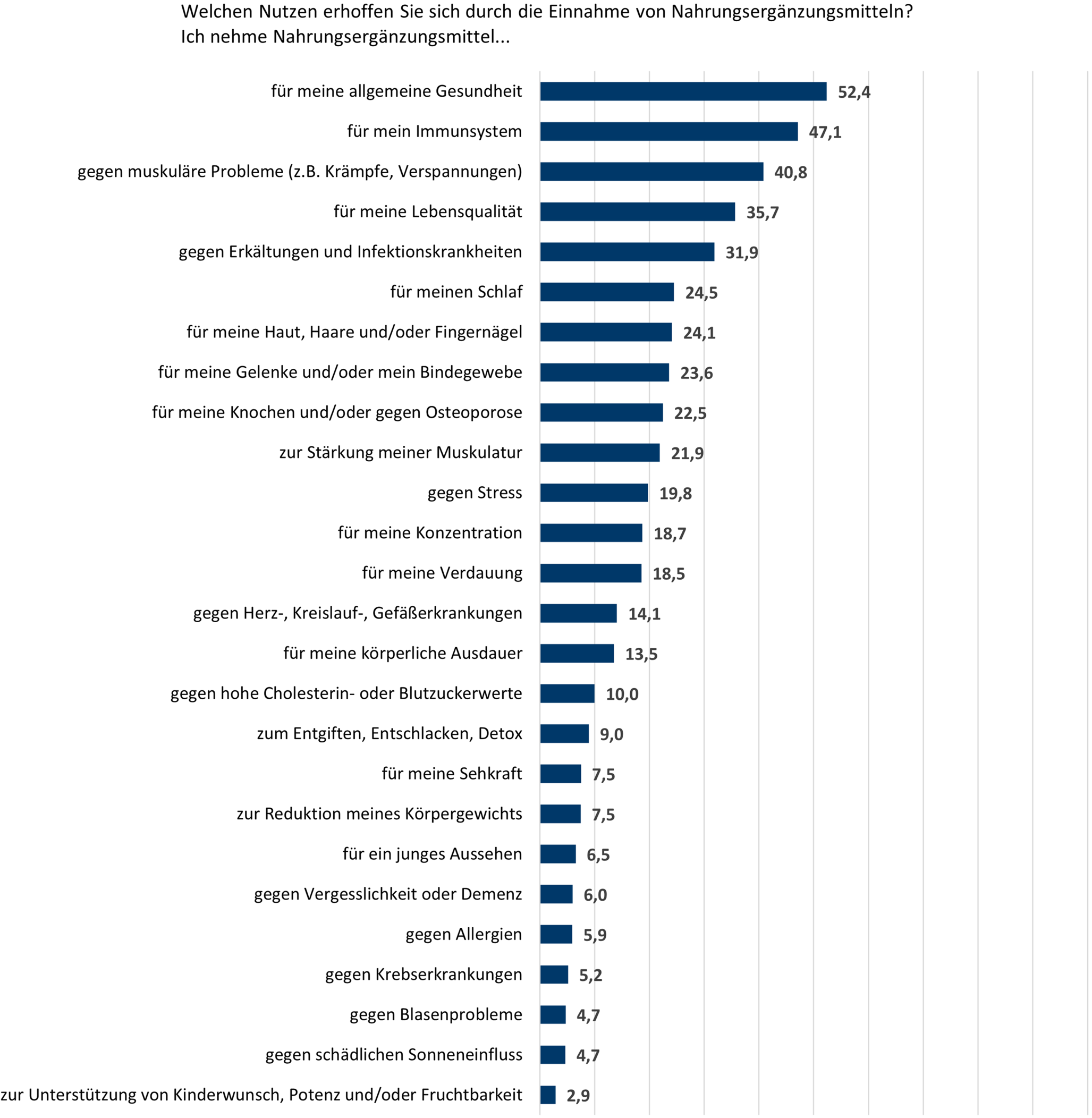 Nach spezifischen Anwendungsbereichen gefragt, gab mehr als die Hälfte der NEM-Nutzenden an, sich von der Einnahme von NEM einen Vorteil für die allgemeine Gesundheit zu versprechen (Abb. 2). Des Weiteren erhofften sich viele Befragte einen Nutzen für ihr Immunsystem bzw. gegen Erkältungen und Infektionskrankheiten, gegen muskuläre Probleme und für ihre Lebensqualität.