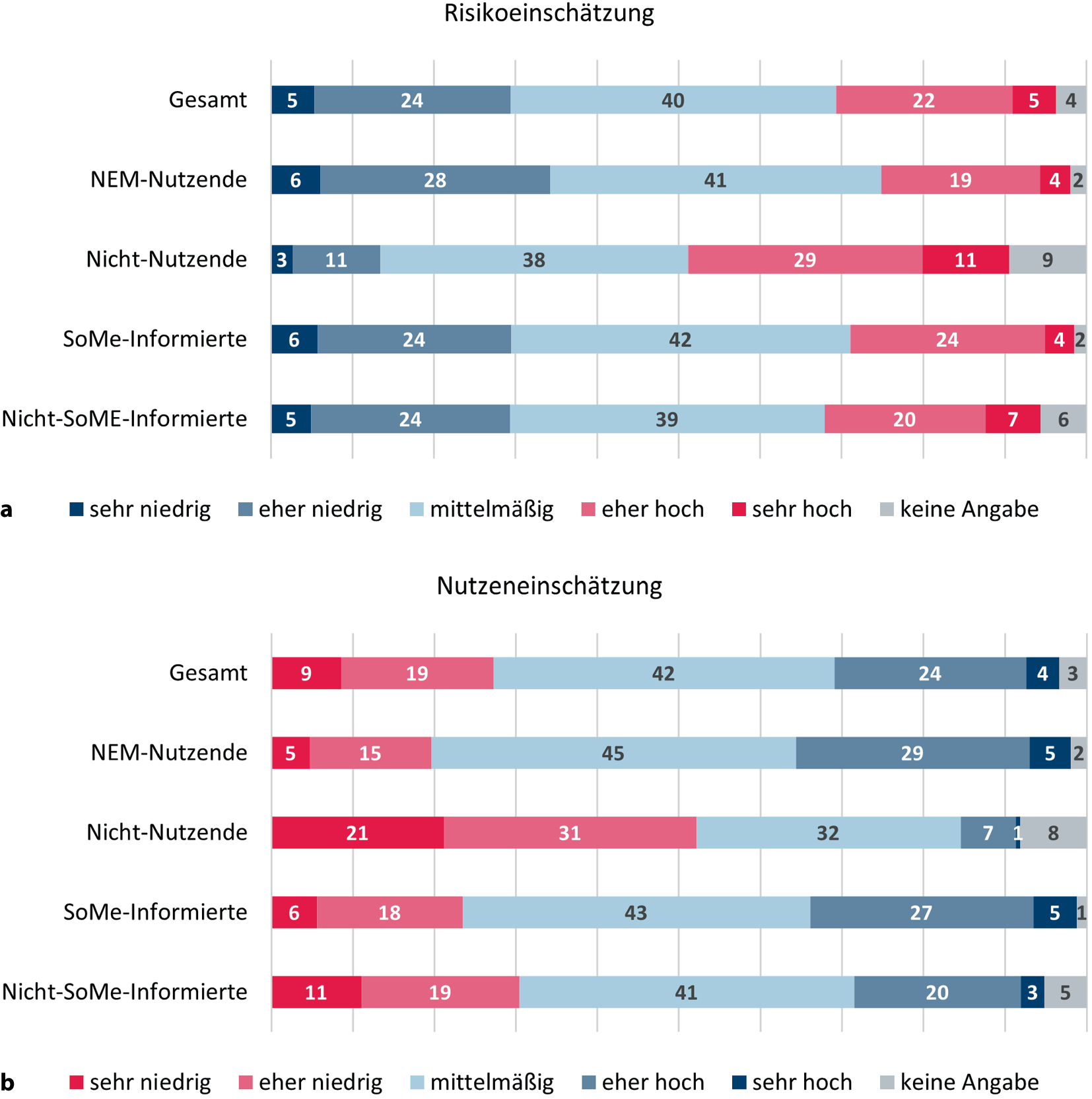 Risiko- (a) und Nutzeneinschätzung (b) nach NEM-Einnahme und SoMe-Informiertheit; Angaben in Prozent; gesamt: n = 1071, NEM-Nutzende: n = 824, Nichtnutzende: n = 247, SoMe-Informierte: n = 486, Nicht-SoMe-Informierte: n = 585 (Fallzahlen ungewichtet); Rundungsdifferenzen möglich. NEM Nahrungsergänzungsmittel, SoMe soziale Medien