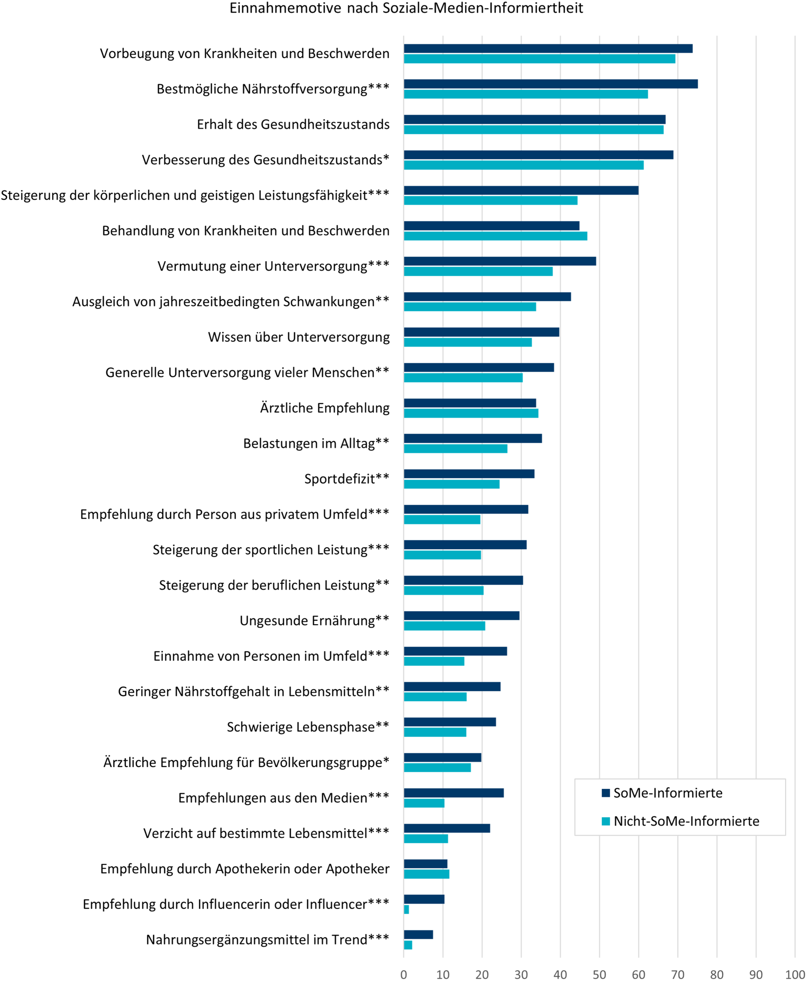 Zustimmung zu Motiven für die NEM-Einnahme („trifft voll und ganz zu“ oder „trifft eher zu“) unter NEM-Nutzenden nach SoMe-Informiertheit; signifikante Mittelwertunterschiede: *p < 0,05, **p < 0,01, ***p < 0,001; Angaben in Prozent; SoMe-Informierte: n = 391, Nicht-SoMe-Informierte: n = 433 (Fallzahlen ungewichtet). NEM Nahrungsergänzungsmittel, SoMe soziale Medien