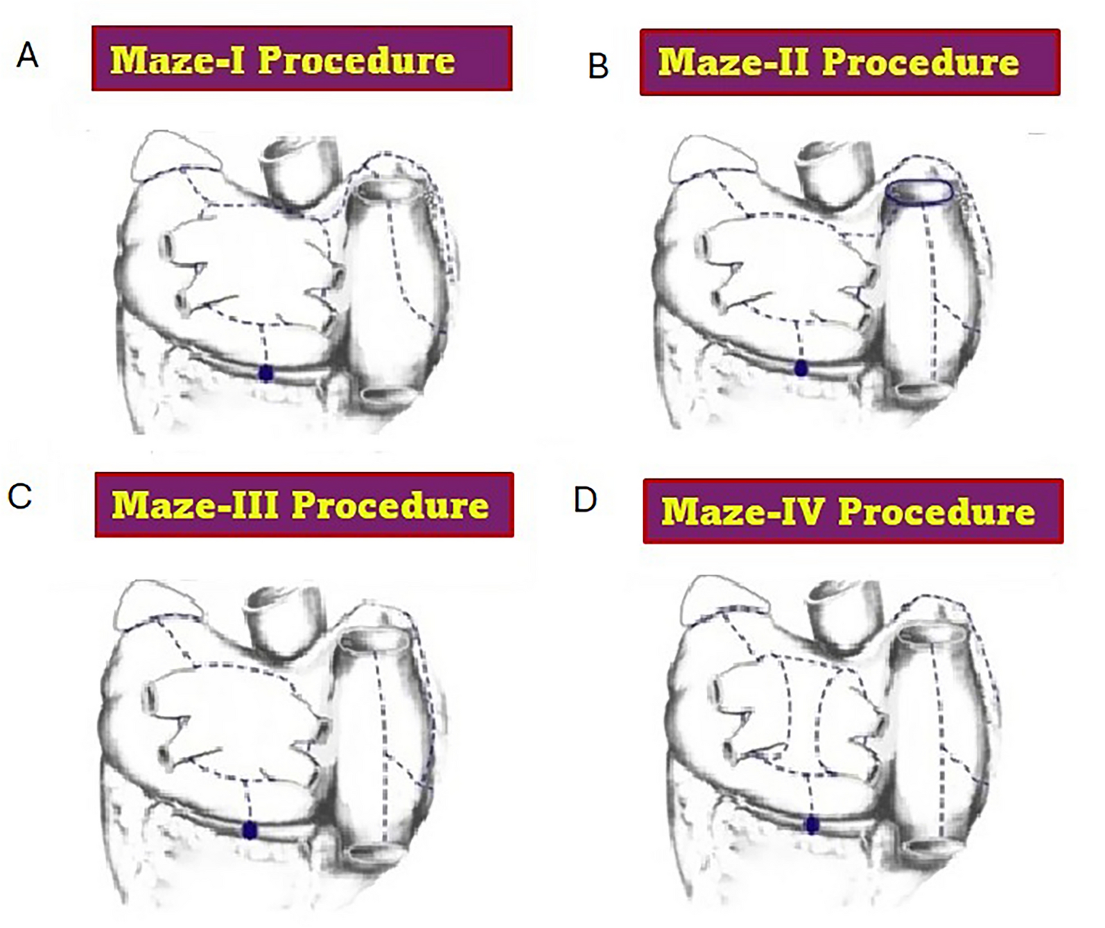 Evolution of the maze procedure from I to IV. The diagrams below illustrate the four iterations of the maze procedure, each of which is discussed extensively in the text. No procedure other than those diagrammed here should be called a “maze procedure”. A Maze I procedure. B Maze II procedure. C Maze III procedure. D Maze IV procedure.