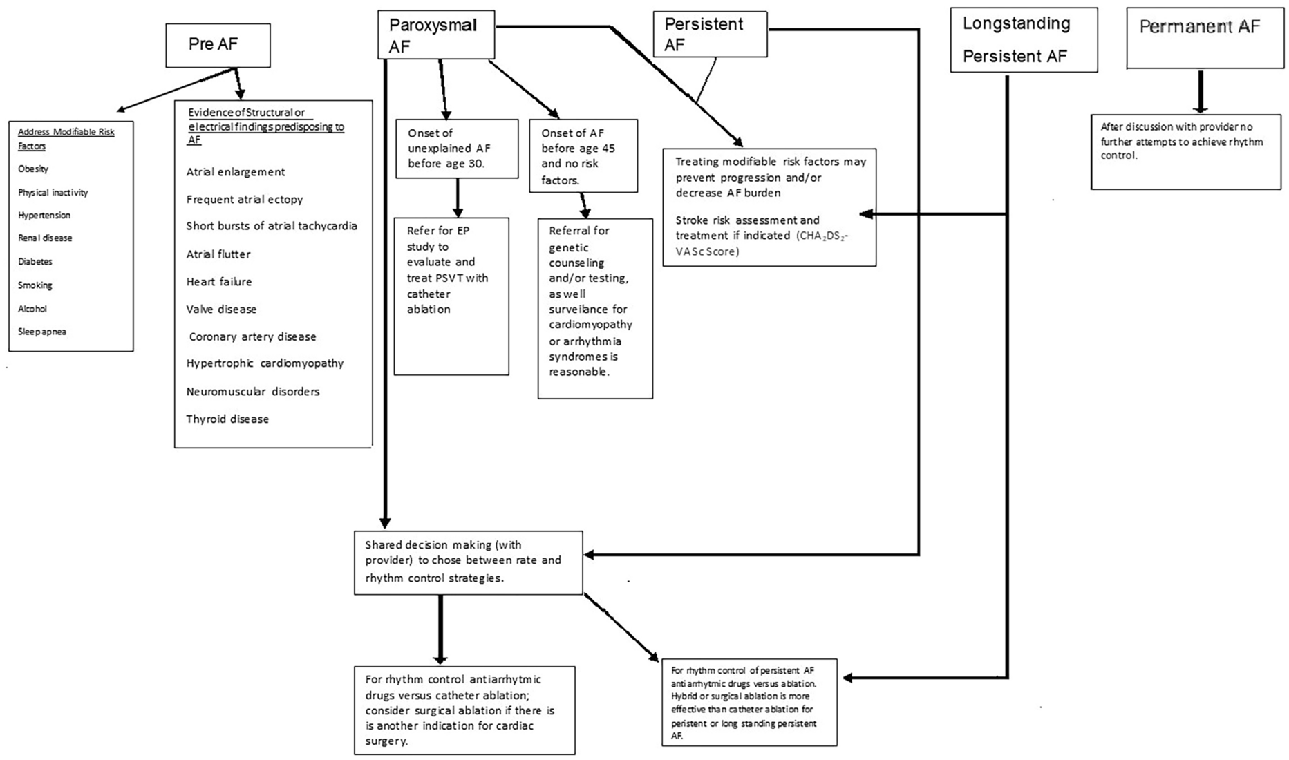 Development of atrial fibrillation (AF) increases the risk of morbidity and mortality. These sequelae include: (1) an irregularly irregular rhythm that may result in uncomfortable palpitations and emotional distress; (2) loss of atrioventricular synchronous contraction, which impairs cardiac hemodynamics and may cause or exacerbate congestive heart failure; and (3) static left atrial blood flow, resulting in enhanced vulnerability to thromboembolism [1]. While early initiation of pharmacologic therapy may provide arrhythmia suppression [2], and reduce the detrimental sequelae of AF, the benefit does not extend to all patients with AF.