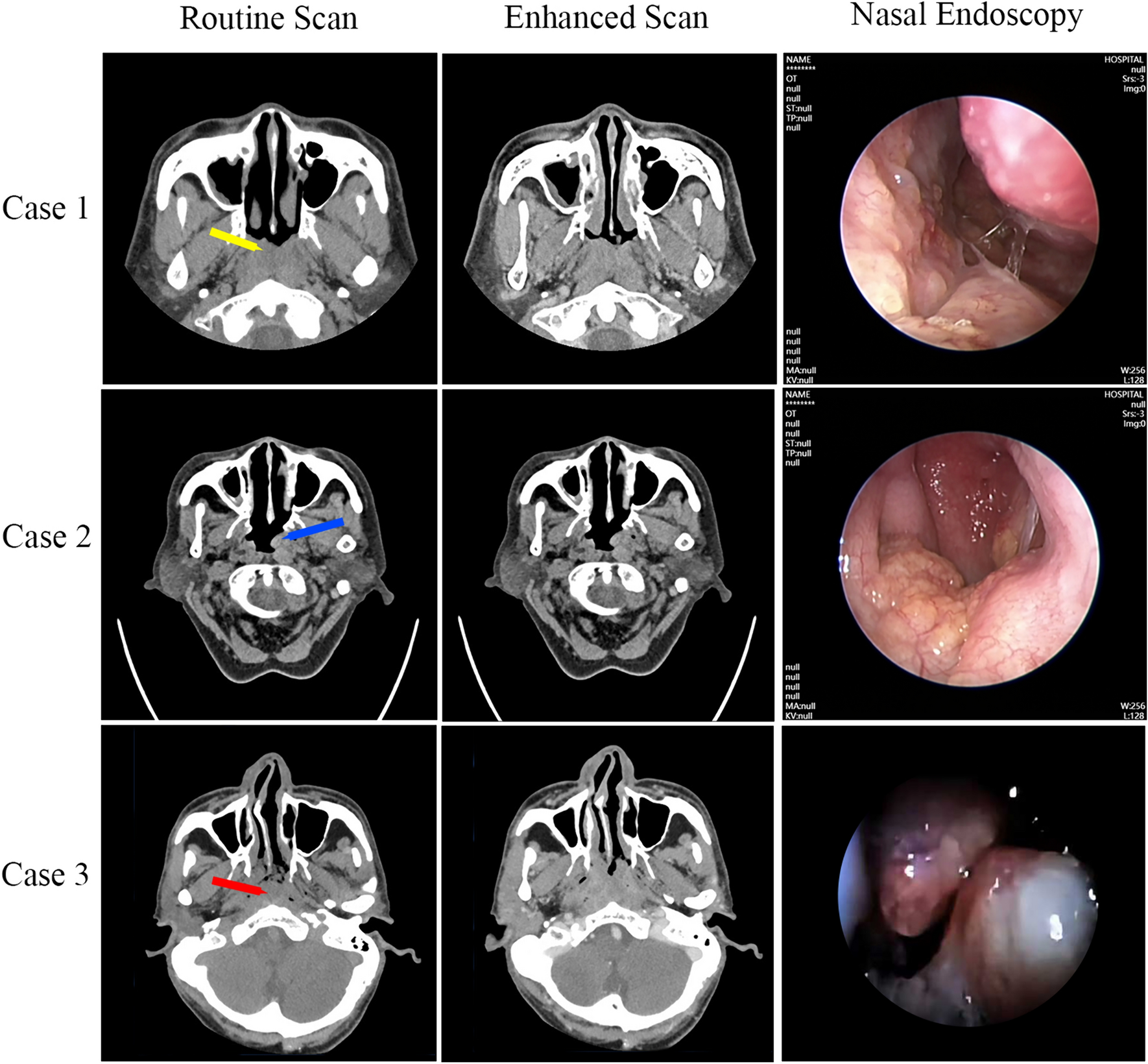 Routine scan, enhanced CT and nasal endoscopy images of three patients. The CT scan revealed low-density, flaky shadows in the nasopharyngeal cavity, with uneven density and an unclear boundary. The enhanced scan displayed mild enhancement and partial non-enhancement. The nasal endoscopy revealed an irregular, gray-red mass obstructing the nasopharyngeal cavity, accompanied by a rough mucosal surface