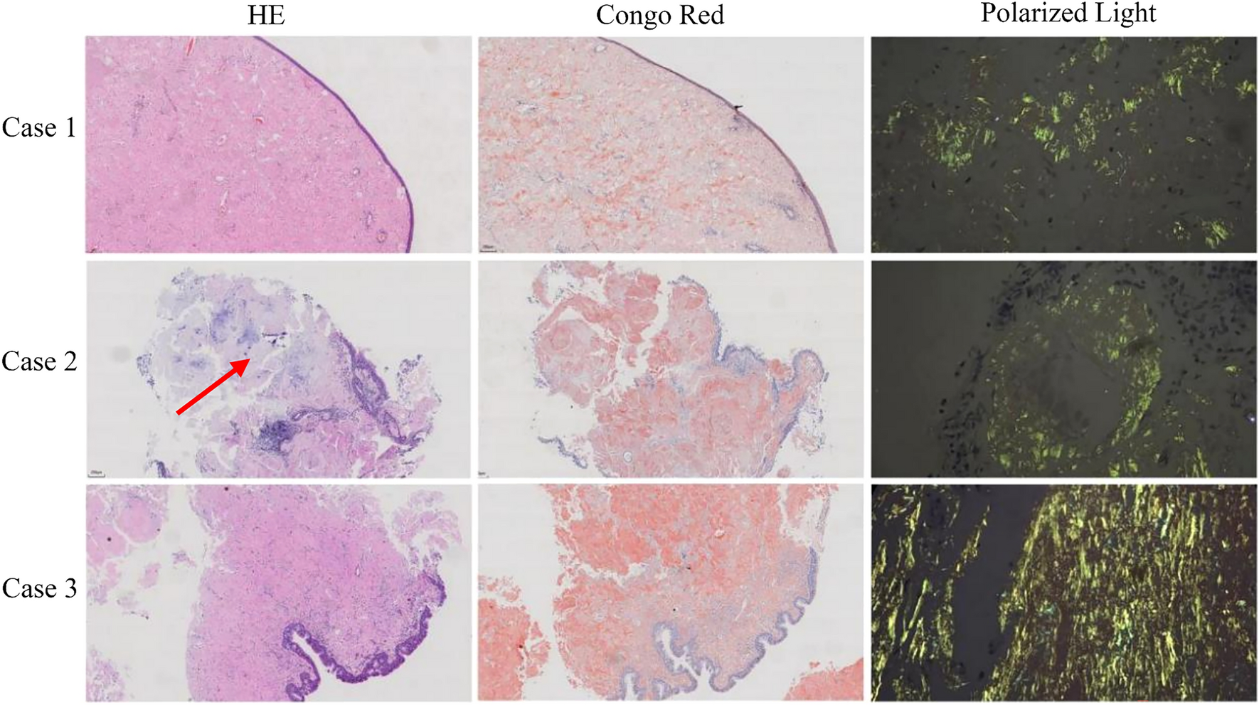 HE and Congo red staining of amyloidoma. Under a light microscope (4 ×), amyloid appears as a uniform pink amorphous substance, the same areas exhibit Congo red staining, resulting in a typical brick-red appearance color. Under a polarized light microscope, Congo red-stained slides exhibit a characteristic birefringent apple green color. Additionally, Case 2 demonstrates local cartilage hyperplasia and calcification, as indicated by the red arrow