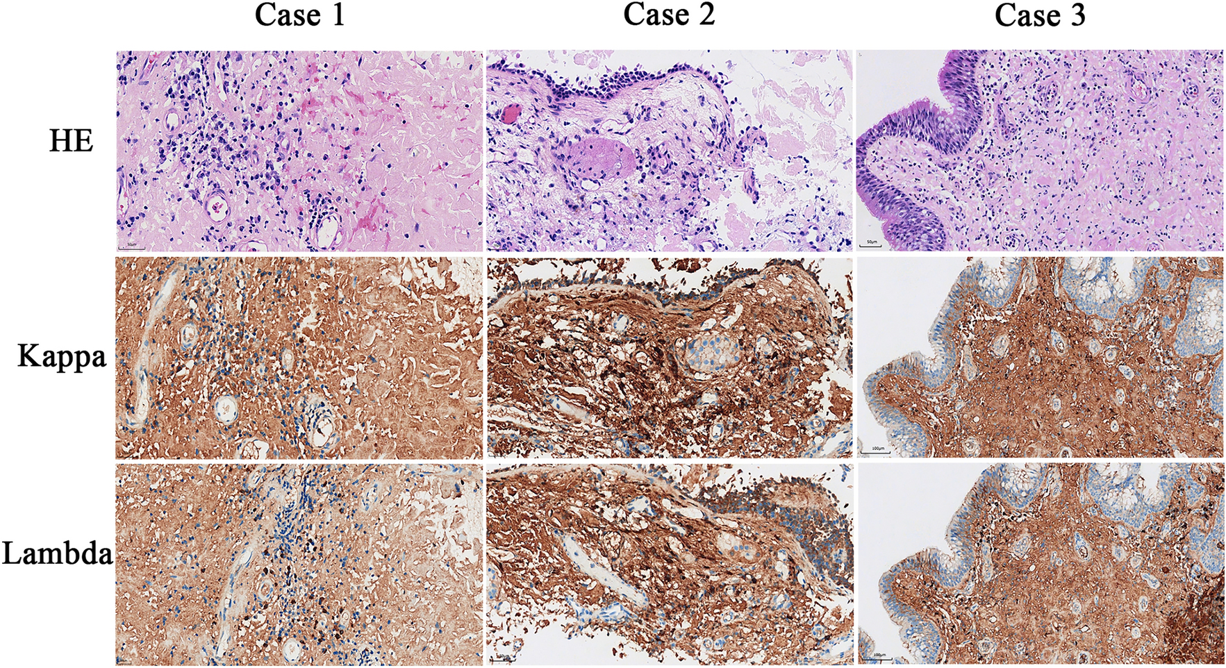The IHC results of amyloid proteins in 3 cases. IHC staining showing κ and λ light chains immunoglobulin expression in amyloid material and nearby plasma cells (200 ×)