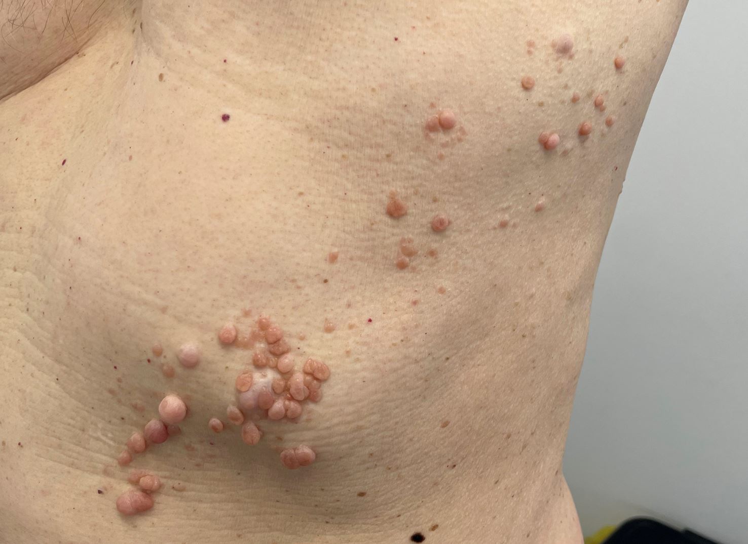 Bei dem 58-jährigen Patienten bestanden seit fast 30 Jahren multiple hautfarbene, weiche, indolente Papeln und Knoten mit einem Durchmesser von 2-12 mm an der linken Thoraxwand. Sonderlich gestört hatten ihn die Veränderungen nie, aber nun wollte er sie doch einmal abklären lassen.