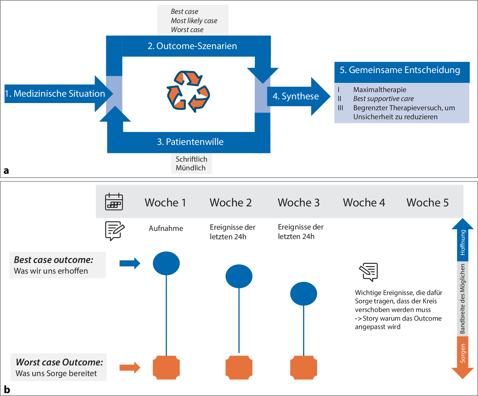 Das Ziel dieses Konzepts ist es, Angehörigen im Sinne einer „story line“ [35] eine klare Vorstellung von den möglichen Entwicklungen zu geben, um realistische Erwartungen zu setzen und gemeinsam fundierte Entscheidungen zu treffen (Abb. 1b).