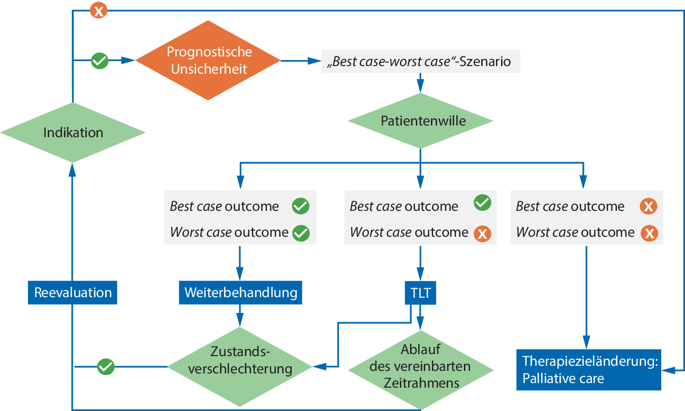 Da der zeitliche Rahmen neurologischer Rehabilitation abhängig von zugrunde liegender Erkrankung, Alter und Begleiterkrankungen Wochen bis Monate umfassen kann, bedürfen TLT in der Neurointensivmedizin unter Umständen auch sektorenübergreifender (Akutversorgung/Rehabilitation/Langzeitpflege) Kommunikation, Reevaluation und Umsetzung. Damit unterscheidet sich ein TLT in der Neurointensivmedizin häufig von dem TLT bei anderen intensivmedizinischen Erkrankungen mit nahezu infauster Prognose, in dem Patienten nur noch eine sehr geringe Chance für ein positives Outcome eingeräumt wird.