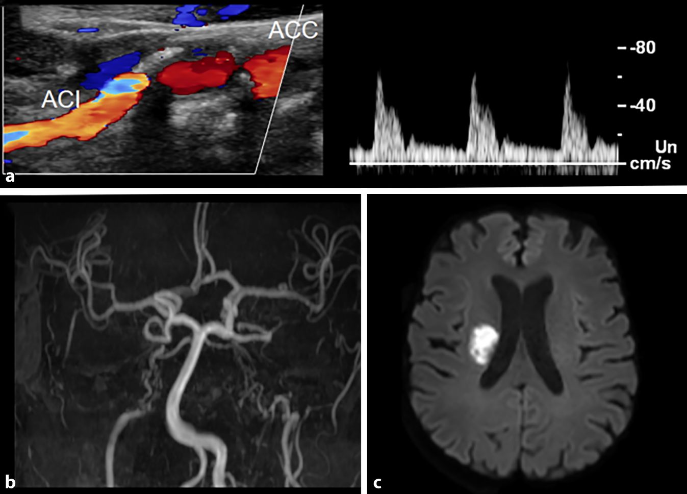 a Farbduplexsonographie der A. carotis interna (ACI) und A. carotis communis (ACC) rechts und Dopplerfrequenzspektren der ACI. Plaque am Abgang der schmächtigen A. carotis interna, die Flussgeschwindigkeit relativ niedrig und pulsatil. b „Maximum intensity projection“ einer 3‑D-Time-of-flight-Angiographie in koronarer Schnittführung, Abbruch der ACI beidseits und angedeutete Darstellung des Rete mirabile. c Diffusionsgewichtete Darstellung (isotrope Darstellung, b‑Wert: 1000), isotrope (richtungsunabhängige Darstellung), Nachweis einer Diffusionsstörung rechts paraventrikulär