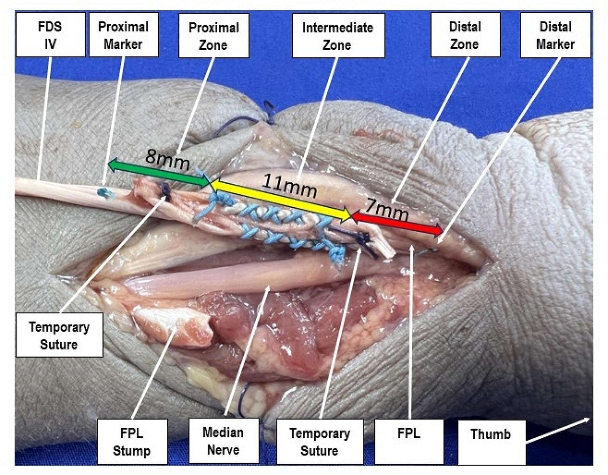 Next, a permanent mark was set by means of a PDS 3-0 suture 0.8 cm proximal and 0.7 cm distal to the side-to-side suture, acting as landmark during measurement after biomechanical testing. Based on these markings, the sutured tendon was divided in 3 zones: proximal—from the start of the suture with either DC or FW to the proximal marker, distal—from the end of the suture with either DC or FW to the distal marker, and intermediate—11 mm interleaving zone of DC or FW (Fig. 1). Finally, the FDS-IV tendon was cut at its musculo-tendinous transition and attached with a PDS 3-0 suture to a looped 1.5 mm braided steel wire. Fingers II-IV were taped in extension in order to allow free passage of the flexing thumb. All instrumentations and measures were performed by one experienced hand surgeon.