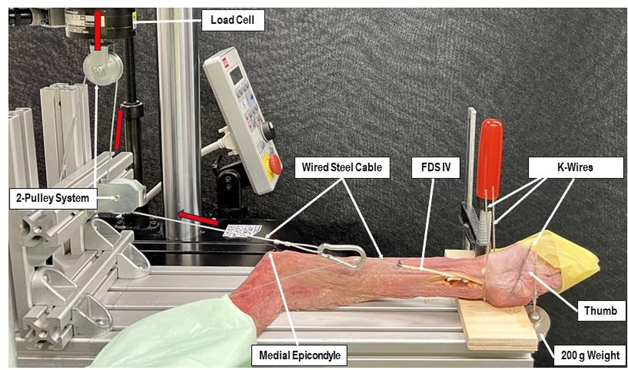 An electrodynamic material testing machine (Acumen III, MTS Systems Corp., Eden Prairie, MN, USA) equipped with a 3 kN load cell was used for biomechanical testing (Fig. 2). The specimens were placed in supine position on a wooden board such that the thumb was passively extended via an attached 200 g weight. Additionally, an interphalangeal (IP) joint arthrodesis using a 1.4 mm Kirschner (K-) wire was performed in order to stabilize the thumb during flexion. The hand was fixed on the board with a 1.6 mm K-wire through the first metacarpal bone radial to the FPL tendon. Besides that, one 2.0 mm K-wire was placed in front of the radial wrist and two 2.0 mm K-wires were placed at its dorsum, prohibiting any kind of movement of the forearm or wrist and avoiding irritation to the tested tendons. The wooden board was then securely attached to the base of the testing machine. The looped steel cables were attached to the testing machine via a simple pulley block system transmitting vertical load to a force vector along the axis of the tendon’s physiological way.