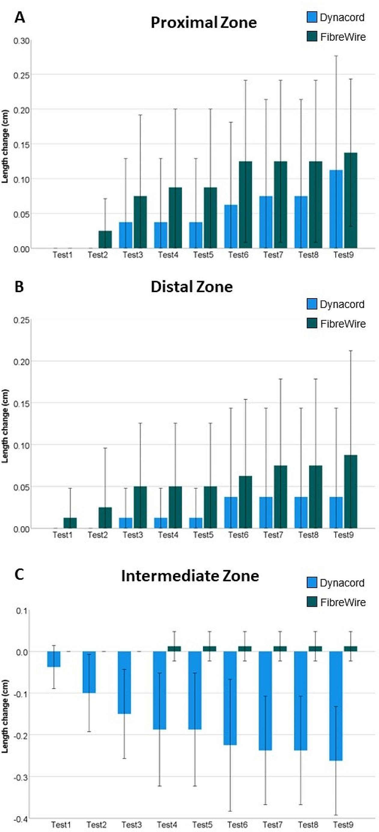 Length changes for the proximal (A), distal (B) and intermediate (C) zone after each cyclic test session over 9 days (Test1 to Test9), presented for each group (Dynacord and FibreWire) separately in terms of mean value and SD