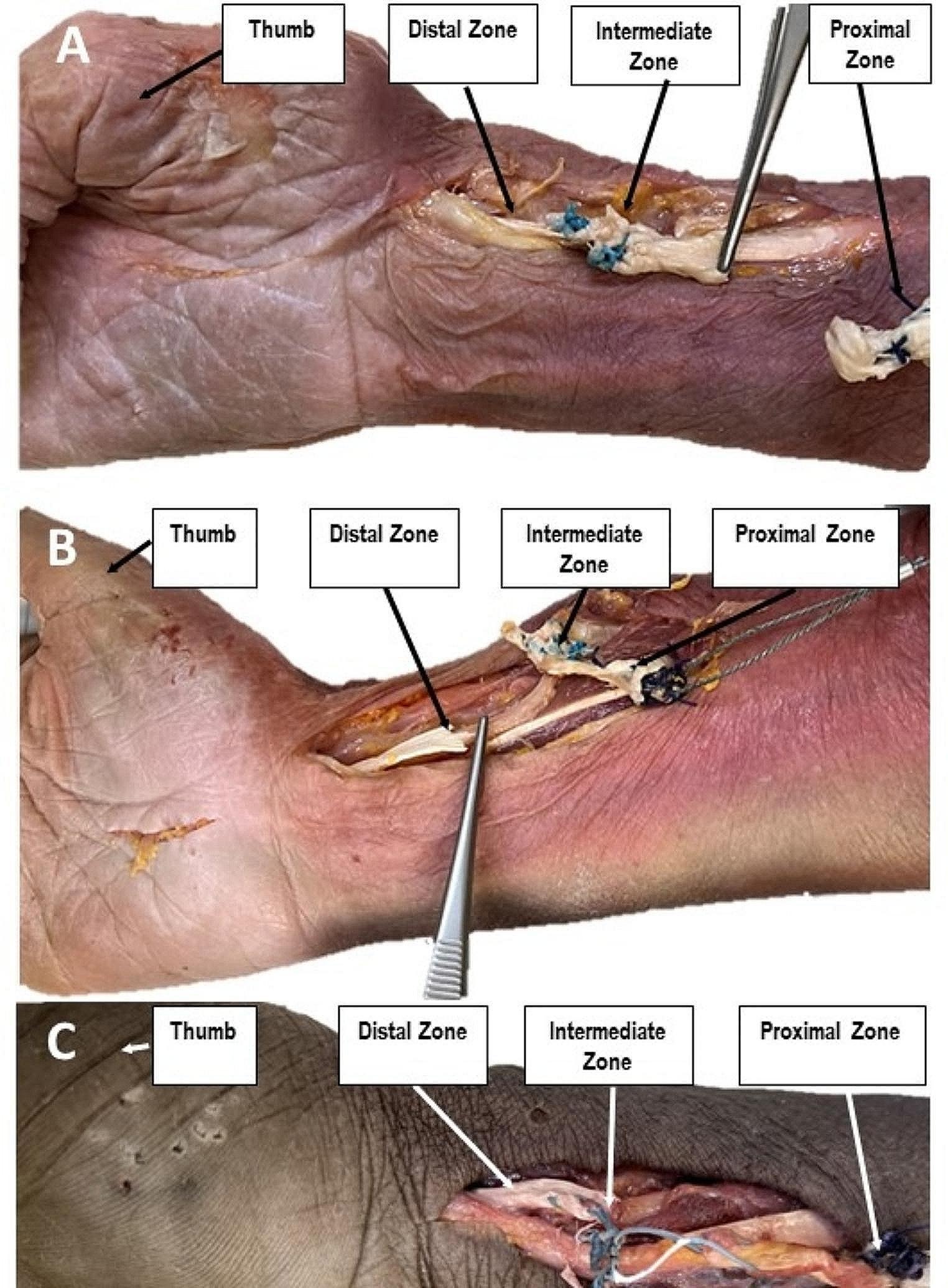 View from palmar to failures of 3 different right specimens treated with FW (A, B and C). A: Failure mode indicating tendon rupturing in the proximal zone; B: Failure mode indicating tendon rupturing in the distal zone; C: Failure mode indicating tendon rupturing in the intermediate zone