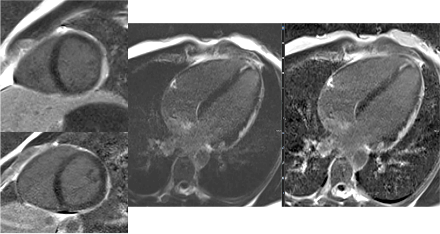 (Tissue integrity assessment by T2 and LGE imaging): the capability of a non-invasive complete assessment of tissue integrity (edema yes/no, fibrosis yes/no) is one of the hallmarks of MRI. Healthy myocardium shows a dark (“hypointense”) signal in T2 imaging (first two images in the left upper row) as well as a dark signal in LGE imaging (right upper row LGE-SAX in IR and PS reconstruction; lower row—LV 2CV- and 4 CV-LGE)