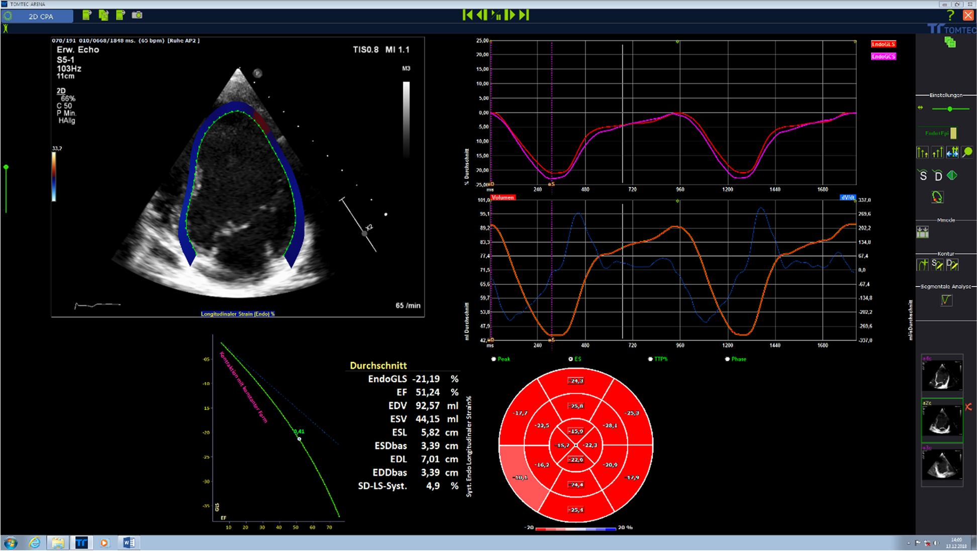 2D strain imaging allows the assessment of global and regional function based on the determination of qualitative and quantitative parameters (longitudinal, radial, circumferential strain): vendor-independent analysis software tools (such as the Tomtec 2D-CPA analysis) visualize LV myocardium, strain curves, and summarize the results in “bull-eye” plots, generating a fast and comprehensive overview on cardiac function