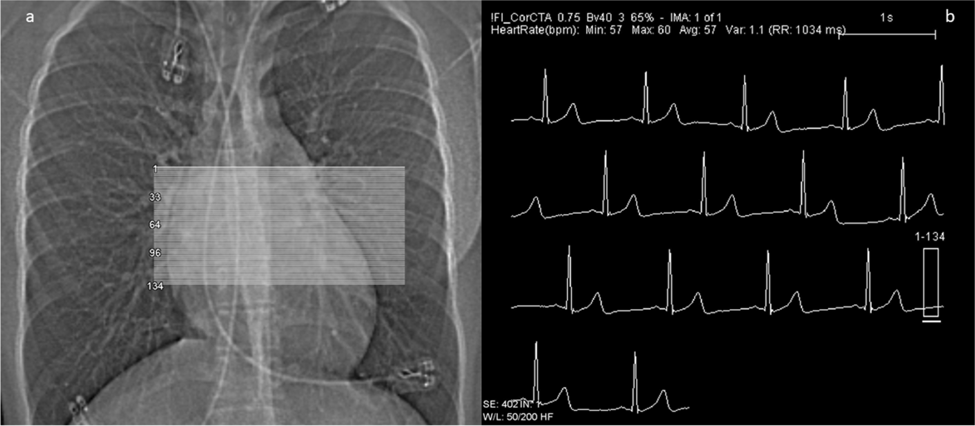 (Planning and dose monitoring): first steps are a fast low-dose overview (“topogram/sinogram”; left) and a stable ECG monitoring (right) for triggering (prospective mode) or gating (retrospective mode). Figures 2 and 3 derive from the CT of a 15-year-old girl after surgical repair of a malignant coronary anomaly (origin of the left main from the right coronary sinus) with reinsertion of the left main coronary artery with an ultra-low radiation dose (total DLP 9 mGycm ~ 0.2 mSv)