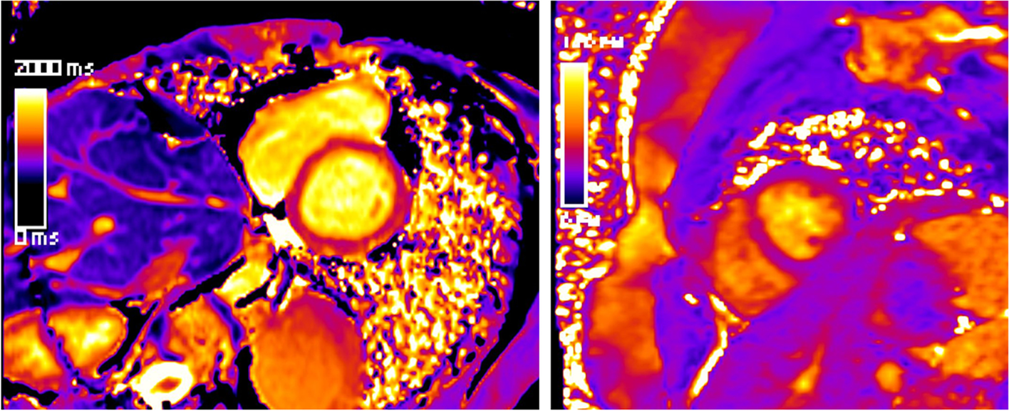 (Mapping): T2 map (left) anteroseptally 37–40 ms; inferolaterally 49–56 ms, T1 map prä KM (right) anteroseptally 1278 ms; inferolaterally 1263 ms. The color maps allow a rapid assessment of edema and inflammation/fibrosis plus the quantification (in regions, which are conspicuous in LGE and/or maps)