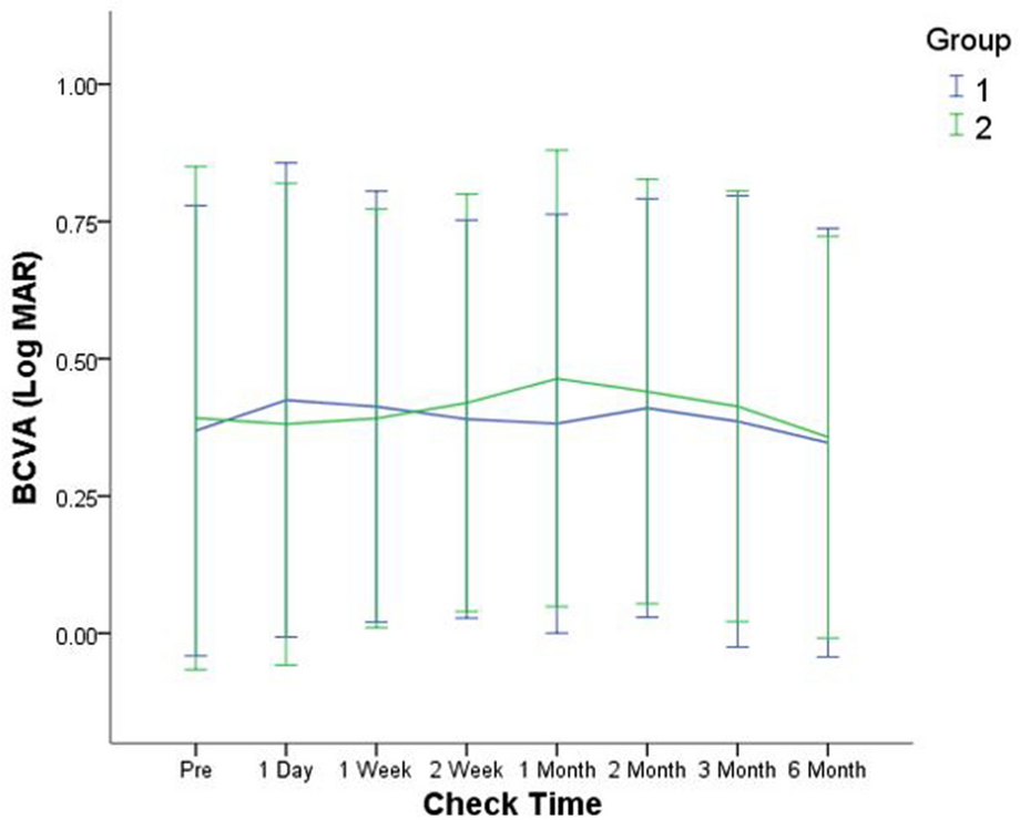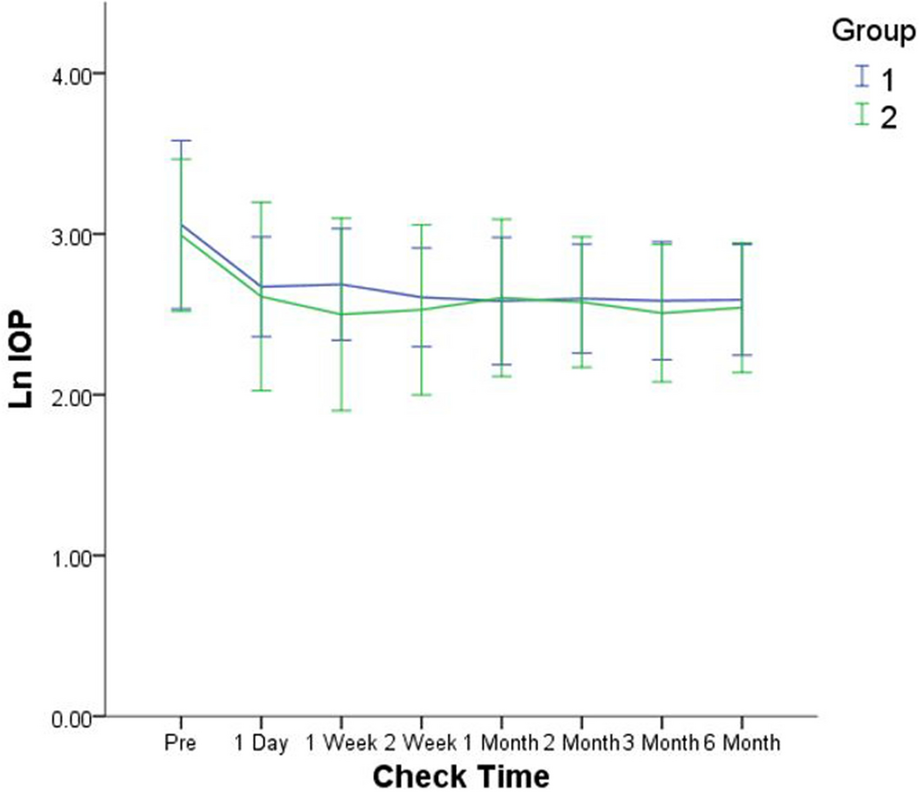 The preoperative baseline IOP was 23.32 ± 1.33 mmHg in group 1 and 22.36 ± 0.98 mmHg in group 2. The IOP of both groups obviously decreased after surgery. Because IOP data did not conform to normal distribution functions, data of the two groups at each follow-up time point are presented using median and interquartile range in Table 2 and changed into log-normal functional data to fit the normal distribution. Figure 3 illustrates the IOP change (log-normal functional data) after trabeculectomy in the two groups. The difference between the two groups was not significantly different at any time interval (repeated-measures ANOVA, P = 0.374).
