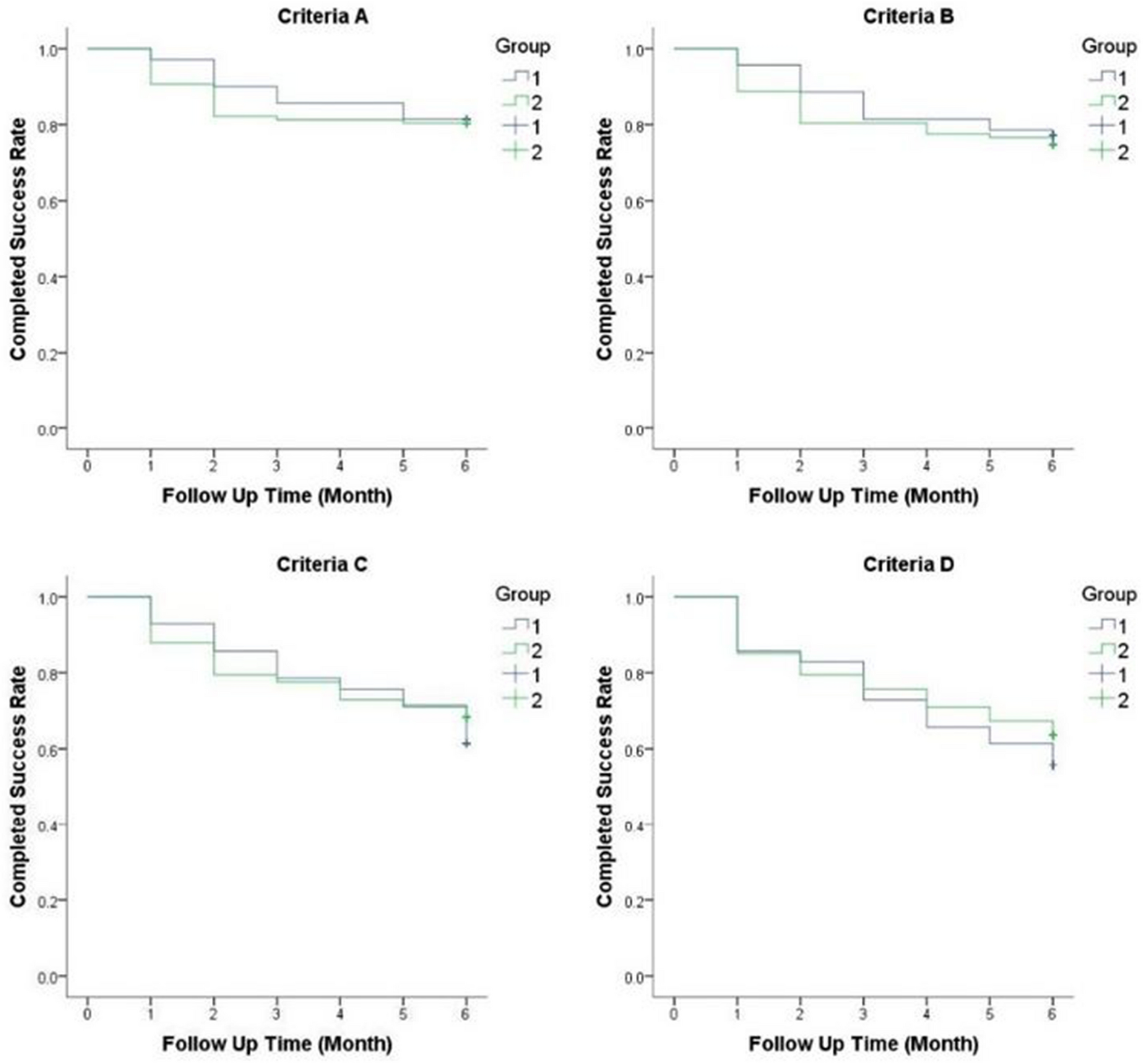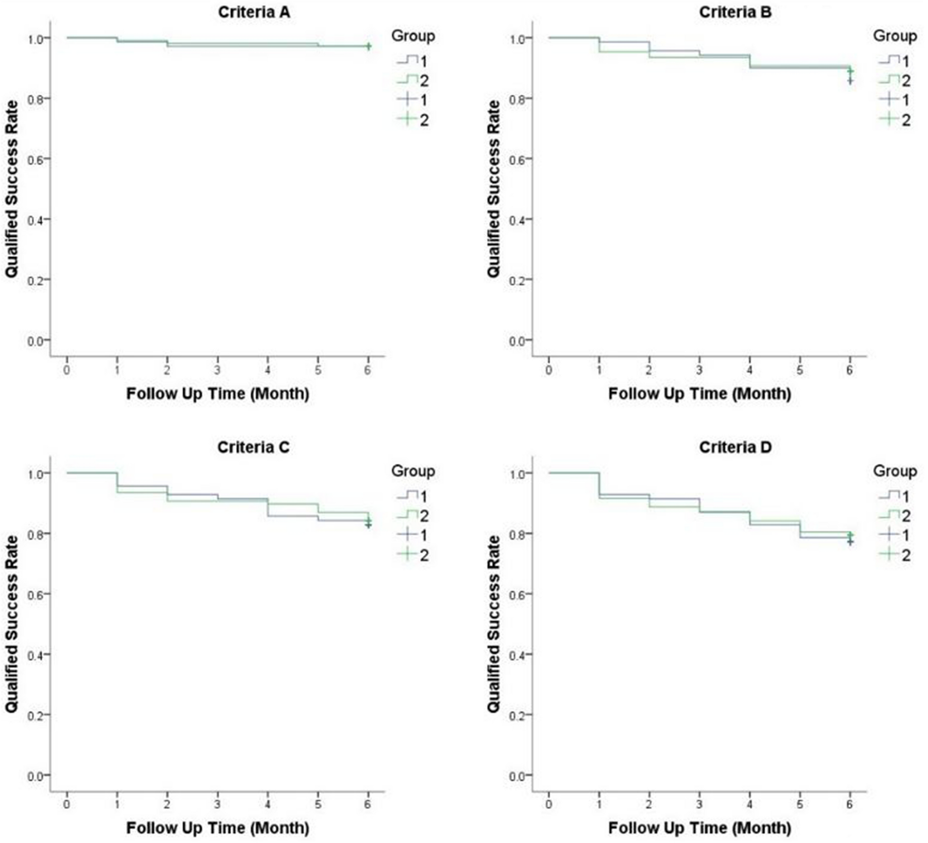 According to the global glaucoma guidelines, complete success was defined as postoperative patients with IOP ≤ 21 mmHg and ≥ 6 mmHg after surgery without using glaucoma medications. Qualified success was defined as patients with IOP ≤ 21 mmHg after using glaucoma medications. If the IOP was ≥ 21 mmHg with maximum glaucoma medications 3 months after surgery, the operation was considered a failure. To further assess the differences in success rates between the two groups, we further subdivide completed success rates according to the following criteria: criteria A, IOP of 21 mmHg or less with either 15% or greater reduction in IOP compared with the preoperative IOP level; criteria B, IOP of 18 mmHg or less with either 20% or greater reduction in IOP compared with the preoperative IOP level; criteria C, IOP of 15 mmHg or less with either 25% or greater reduction in IOP compared with the preoperative IOP level; criteria D, IOP of 12 mmHg or less with either 30% or greater reduction in IOP compared with the preoperative IOP level. Qualified success rate was similarly subdivided according to the same IOP level but with glaucoma medications.