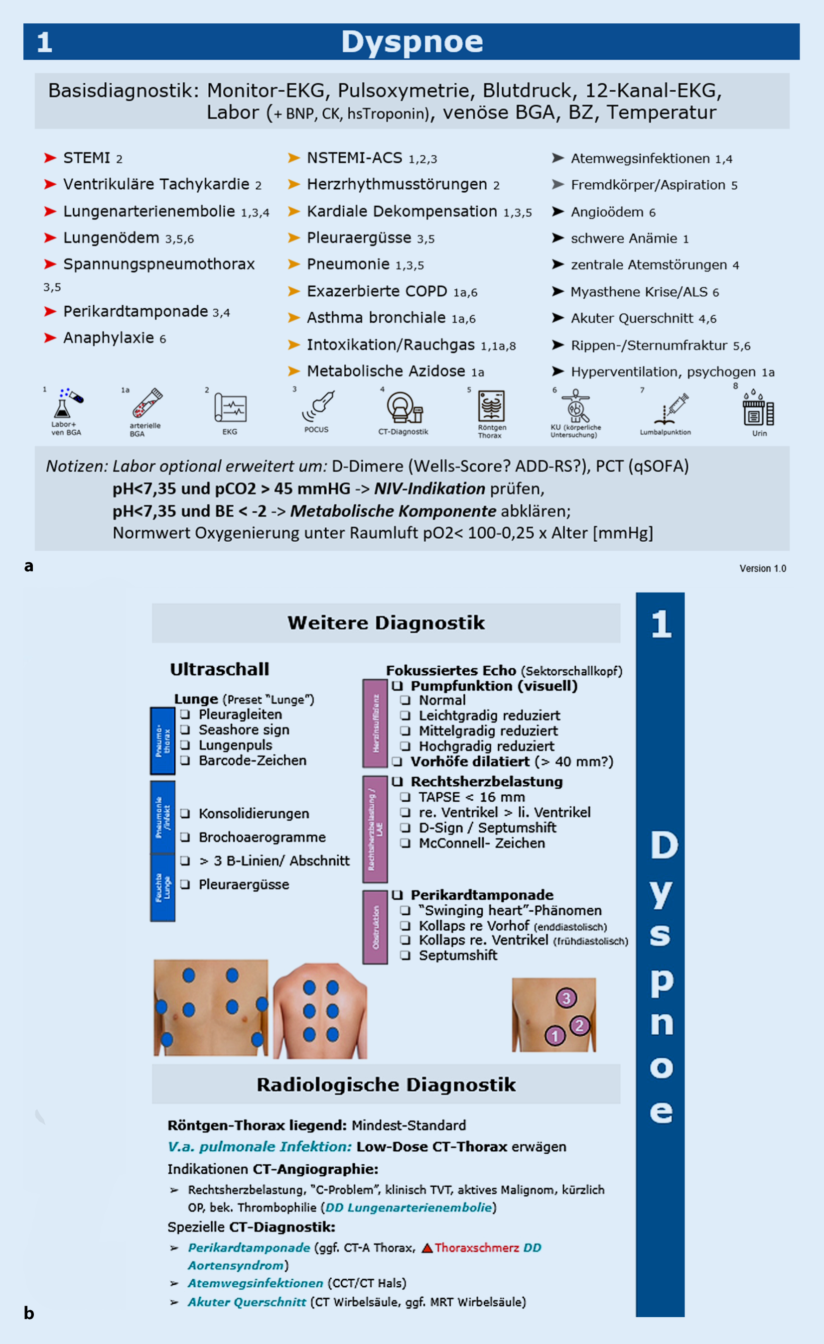 Vorder- (a) und Rückseite (b) der Version 1.0 der leitsymptomorientierten Diagnosekarte „Dyspnoe“ aus dem nichttraumatologischen Schockraummanagement im Advanced Critical Illness Life Support (ACiLS®)