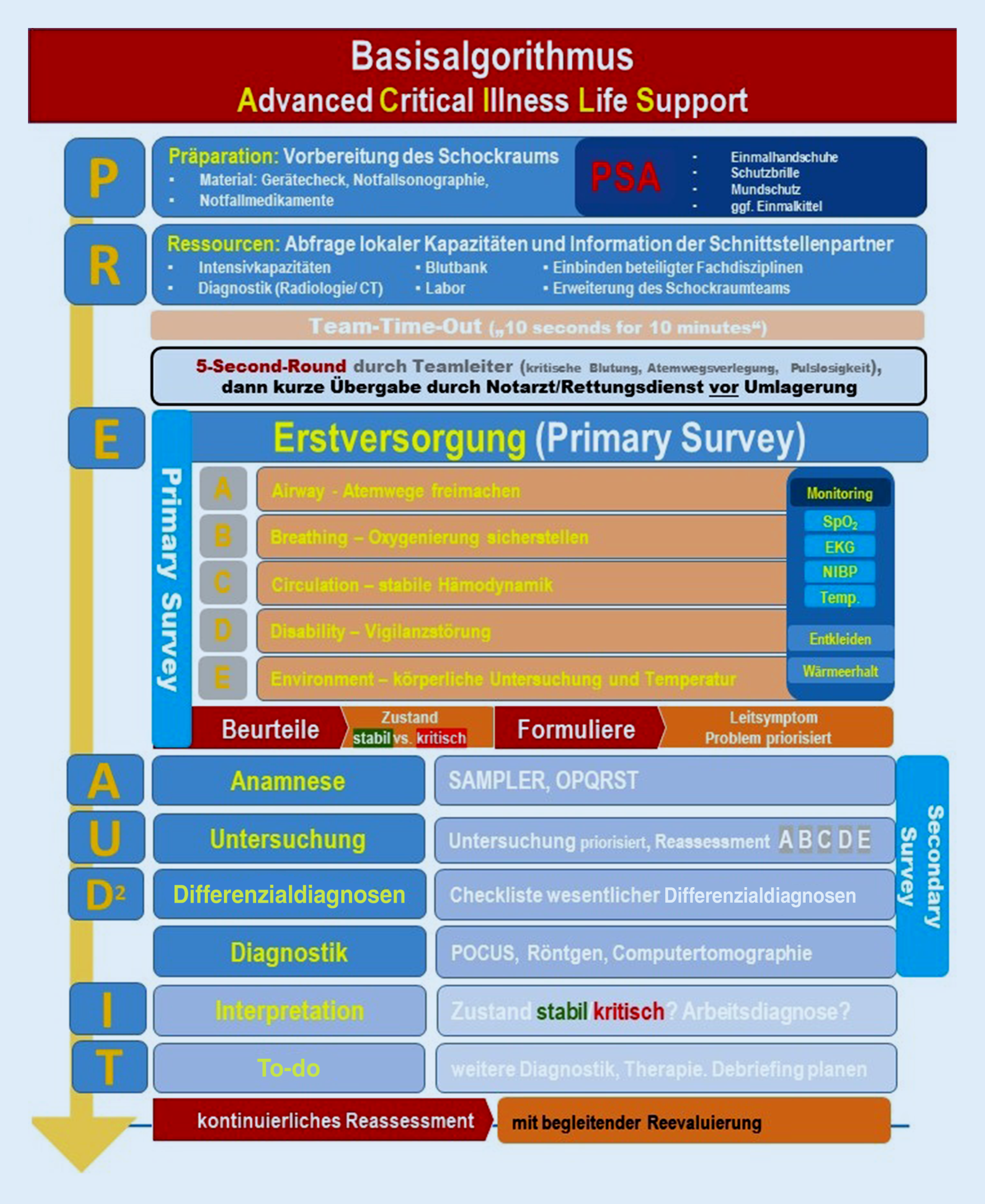In der Notfallmedizin existieren viele Akronyme, um Handlungsalgorithmen besser erinnerbar zu machen. Diese Akronyme sind aber in ein Gesamtkonzept einzubetten, um die gesamte Behandlung eines Notfallpatienten verständlich zu machen, zu vereinheitlichen und die Dokumentation daran abbilden zu können. Dieses Gesamtkonzept soll zudem in einem Kurssystem erlernt und trainiert werden, hierfür wird gerade das Advanced-Critically-Ill-Life-Support(ACiLS)-Kurskonzept entwickelt.