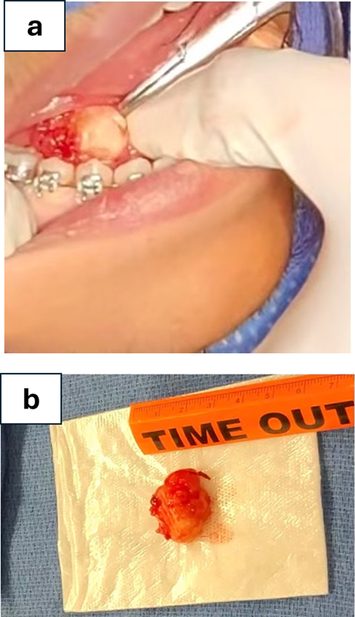 The extraoral examination was unremarkable. Intraoral examination revealed a 2 × 2 × 2 cm, raised, soft and mobile depressible swelling with normal color, of the right anterior floor of the mouth (Fig. 1). The clinical impression of the lesion was a ranula. Computed tomography (CT) examination demonstrated a 2.2 × 1.7 × 1.2 cm soft tissue density-based structure in the right anterior sublingual space (Fig. 2a–c). Preoperative laboratory studies were normal. Linear mucosal incision was made with a bovie electrocautery over the lesion. Blunt dissection was performed with Kelly forceps between mucosa, and the lesion was bluntly dissected to the level of the sublingual gland and completely excised (Fig. 3a, b).