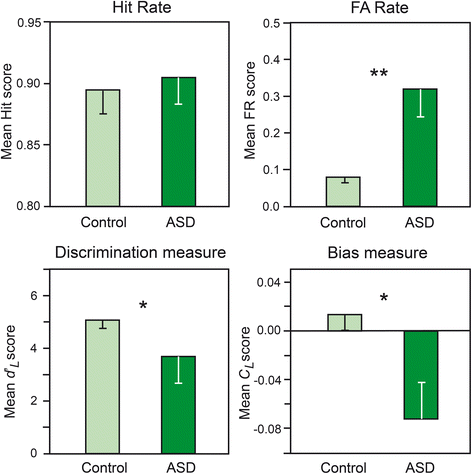 40]. Specifically, bias measurement allows to assess the decision rule adopted by the participants when they are uncertain as to whether an odor is present. Correlatively, errors influence discrimination performances, and it can be hypothesized that people with ASD and controls will show different behaviors, possibly due to attentional deficits [