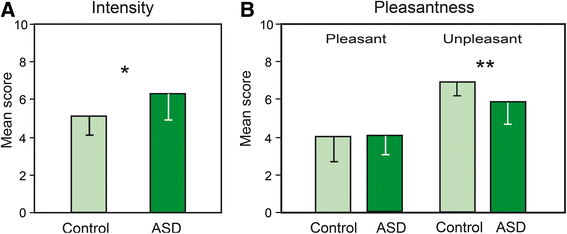 42]. We hypothesized that individuals with ASD would make modified intensity and pleasantness judgments, perceiving odors more intense and/or more unpleasant than control participants. They would display a greater number of errors compared to control participants in the suprathreshold detection task because they would adopt a more liberal decision criterion than the control participants, and would have reduced identification performances.